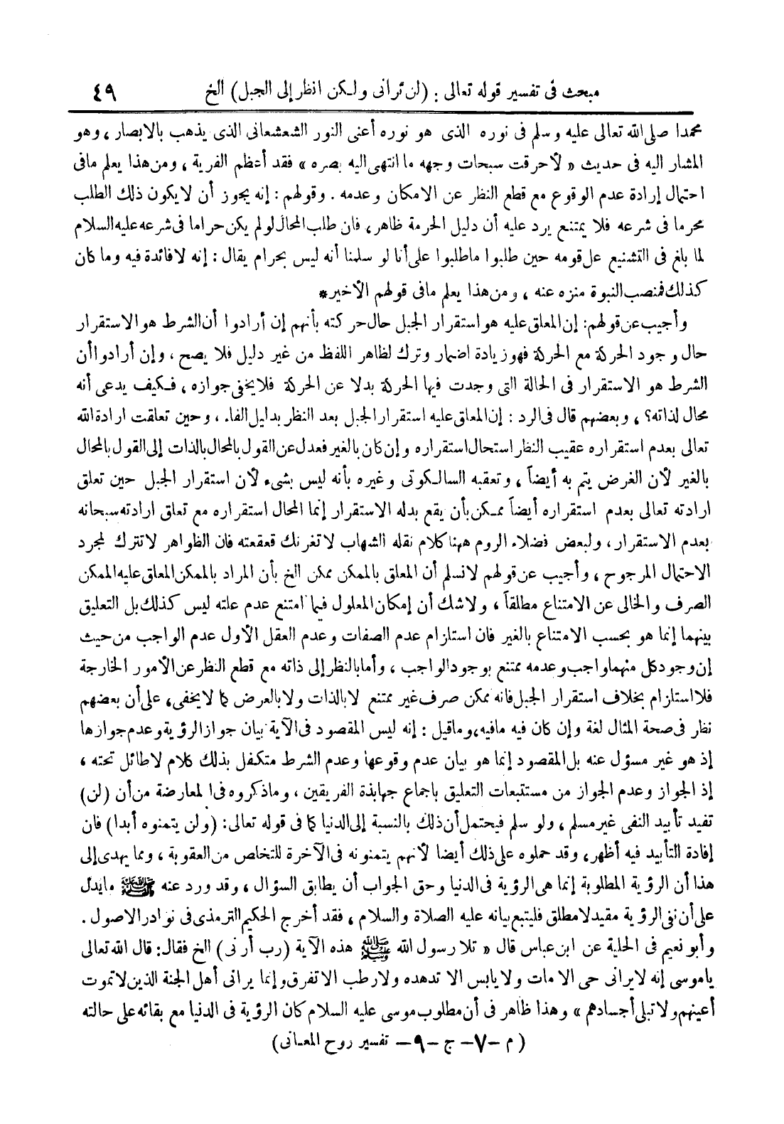 وأجيب عن قولهم : إن المعلق عليه هو إستقرار الجبل حال حركته بأنهم إن أرادوا أن الشرط هو الإستقرار حال وجود الحركة مع الحركة فهو زيادة إضمار وترك لظاهر اللفظ من غير دليل فلا يصح وإن أرادوا أن الشرط هو الإستقرار في الحالة التي وجدت فيها الحركة بدلا عن الحركة فلا يخفى جوازه فكيف يدعي أنه محال لذاته وبعضهم قال في الرد : إن المعلق عليه إستقرار الجبل بعد النظر بدليل الفاء وحين تعلقت إرادة الله تعالى بعدم إستقراره عقيب النظر إستحال إستقراره وإن كان بالغير فعدل عن القول بالمحال بالذات إلى القول بالمحال بالغير لأن الغرض يتم به أيضا وتعقبه الساكوتي وغيره بأنه ليس بشيء لأن إستقرار الجبل حين تعلق إرادته تعالى بعدم إستقراره أيضا ممكن بأن يقع بدله الإستقرار إنما المحال إستقراره مع تعلق إرادته سبحانه بعدم الإستقرار ولبعض فضلاء الروم ههنا كلام نقله الشهاب لاتغرنك قعقعته فإن الظواهر لاتترك لمجرد الإحتمال الرجوح وأجيب عن قولهم لانسلم أن المعلق بالممكن ممكن الخ بأن المراد بالممكن المعلق عليه الممكن الصرف والخالي عن الإمتناع مطلقا ولاشك أن إمكان المعلول فيما امتنع عدم علته ليس كذلك بل التعليق بينهما إنما هو بحسب الإمتناع بالغير فإن استلزم عدم الصفات وعدم العقل الأول عدم الواجب من حيث إن وجود كل منهما واجب وعدمه ممتنع بوجود الواجب وأما بالنظر إلى ذاته مع قطع النظر عن الأمور الخارجة فلا إستلزام بخلاف إستقرار الجبل فإنه ممكن صرف غير ممتنع لا بالذات ولا بالعرض كما لايخفى على أن بعضهم نظر في صحة المثال لغة وإن كان فيه ما فيه وما قيل : إنه ليس المقصود في الآية بيان جواز الرؤية وعدم جوازها إذ هو غير مسؤل عنه بل المقصود إنما هو بيان عدم وقوعها وعدم الشرط متكفل بذلك كلام لا طائل تحته إذ الجواز وعدم الجواز من مستتبعات التعليق بإجماع جهابذة الفريقين وما ذكروه في المعارضة من أن لن تفيد تأييد النفي غير مسلم ولو سلم فيحتمل أن ذلك بالنسبة إلى الدنيا كما في قوله تعالى : ولن يتمنوه أبدا فإن إفادة التأييد فيه أظهر وقد حملوه على ذلك أيضا لأنهم يتمنونه في الآخرة للتخلص من العقوبة ومما يهدي إلى هذا أن الرؤية المطلوبة إنما هي الرؤية في الىنيا وحق الجواب أن يطابق السؤال وقد ورد عنه صلى الله تعالى عليه وسلم مايدل على أن نفي الرؤية مقيد لا مطلق فليتبع بيانه عليه الصلاة و السلام فقد أخرج الحكيم الترمذي في نوادر الأصول وأبو نعيم في الحلية عن ابن عباس قالتلا رسول الله صلى الله عليه و سلم هذه الآية رب أرني الخ فقال : قال الله تعالى ياموسى إنه لايراني حي إلا مات ولا يابس إلا تدهده ولا رطب إلا تفرق وإنما يراني أهل الجنة الذين لاتموت أعينهم ولا تبلى أجسادهم وهذا ظاهر في أن مطلوب موسى عليه السلام كان الرؤية في الدنيا مع بقائه على حالته