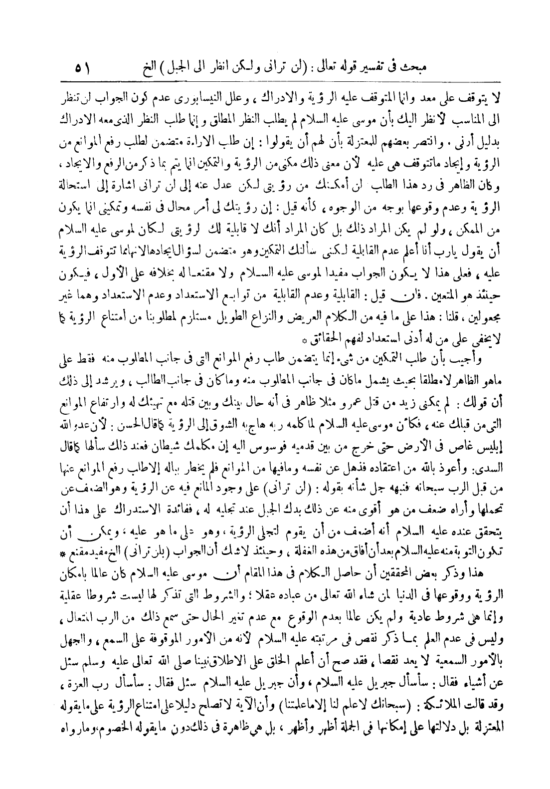 هذا وذكر بعض المحققين أن حاصل الكلام في هذا المقام أن موسى عليه السلام كان عالما بإمكان الرؤية ووقوعها في الدنيا لمن شاء الله تعالى من عباده عقلا والشروط التي تذكر لها ليست شروطا عقلية وإنما هي شروط عادية ولم يكن عالما بعدم الوقوعع مع عدم تغير الحال حتى سمع ذلك من الرب المتعال وليس في عدم العلم بما ذكر نقص في مرتبته عليه السلام لأنه من الأمور الوقوفة على السمع والجهل بالأمور السمعية لا يعد نقصا فقد صح أن أعلم الخلق على الإطلاق نبينا صلى الله تعالى عليه وسلم سئل عن أشياء فقال : سأسأل جبريل عليه السلام وأن جبريل عليه السلام سئل فقال : سأسأل رب العزة وقد قالت الملائكة : سبحانك لا علم لنا إلا ماعلمتنا وأن الآية لاتصلح دليلا على إمتناع الرؤية على ما يقوله المعتزلة بل دلالتها على إمكانها في الجملة أظهر وأظهر بل هي ظاهرة في ذلك دون ما يقوله الخصوم وما رواه