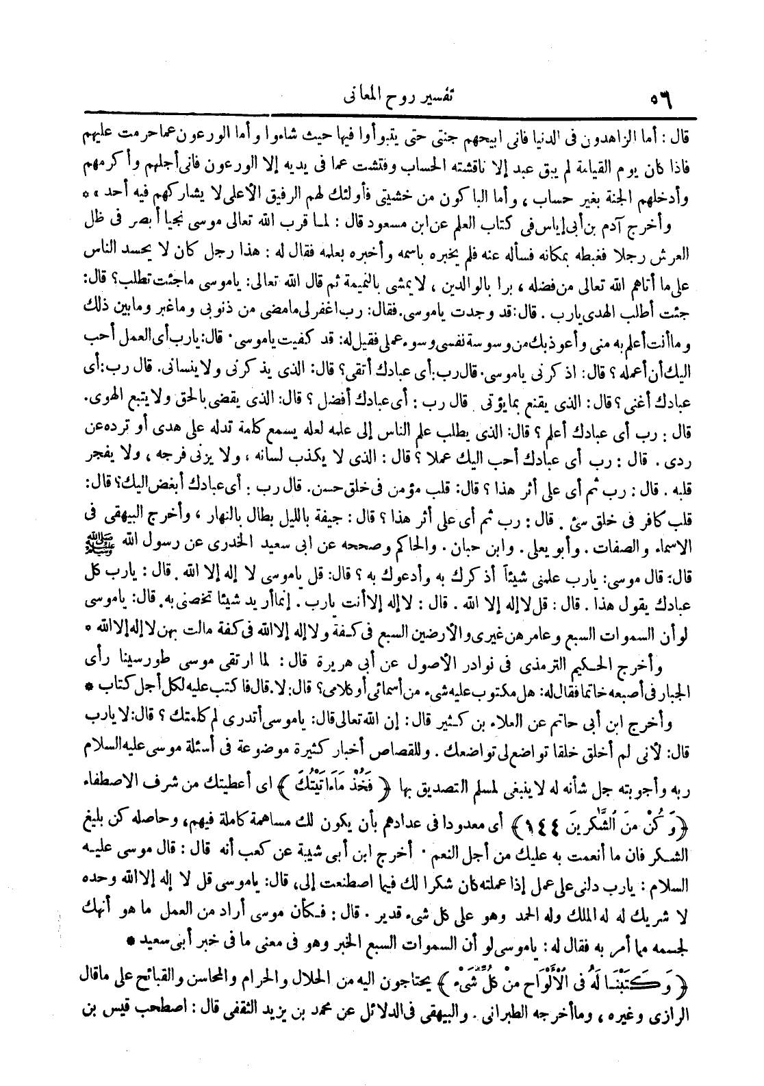 وأخرج آدم بن أبي إياس في كتاب العلم عن ابن مسعود قال : لما قرب الله تعالى موسى نجيا أبصر في ظل العرش رجلا فغبطه بمكانه فسأله عنه فلم يخبره بإسمه وأخبره بعلمه فقال له : هذا رجل كان لايحسد الناس على ماأتاهم الله تعالى من فضله برا بالوالدين لايمشي بالنميمة ثم قال الله تعالى : يا موسى ما جئت تطلب قال : جئت أطلب الهدى يارب قال : قد وجدت يا موسى فقال : رب اغفر لي ما مضى من ذنوبي وما غبر وما بين ذلك وما أنت أعلم به مني وأعوذ بك من وسوسة نفسي وسوء عملي فقيل له : قد كفيت يا موسى قال : يا رب أي العمل أحب إليك أن أعمله قال : اذكرني يا موسى قال رب : أي عبادك أتقى قال : الذي يذكرني ولا ينساني قال رب : أي عبادك أغنى قال : الذي يقنع بما يؤتى قال رب : أي عبادك أفضل قال : الذي يقضي بالحق ولا يتبع الهوى قال : رب أي عبادك أعلم قال : الذي يطلب علم الناس إلى علمه لعله يسمع كلمة تدله على هدى أو ترده عن ردى قال : رب أي عبادك أحب إليك عملا قال : الذي لايكذب لسانه ولا يزني فرجه ولا يفجر قلبه قال : رب ثم أي على أثر هذا قال : قلب مؤمن في خلق حسن قال رب : أي عبادك أبغض إليك قال : قلب كافر في خلق سيء قال : رب ثم أي على أثر هذا قال : جيفة بالليل بطال بالنهار وأخرج البيهقي في الأسماء والصفات وأبو يعلى وابن حبان والحاكم وصححه عن أبي سعيد الخدري عن رسول الله صلى الله عليه و سلم قال : قال موسى : يارب علمني شيئا أذكرك به وأدعوك به قال : قل يا موسى لاإله إلا الله قال : يارب كل عبادك يقول هذا قال : قل لاإله إلا الله قال : لاإله إلا أنت يارب إنما أريد شيئا تخصني به قال : يا موسى لو أن السموات السبع وعامرهن غيري والأرضين السبع في كفة ولاإله إلا الله في كفة مالت بهن لاإله إلا الله