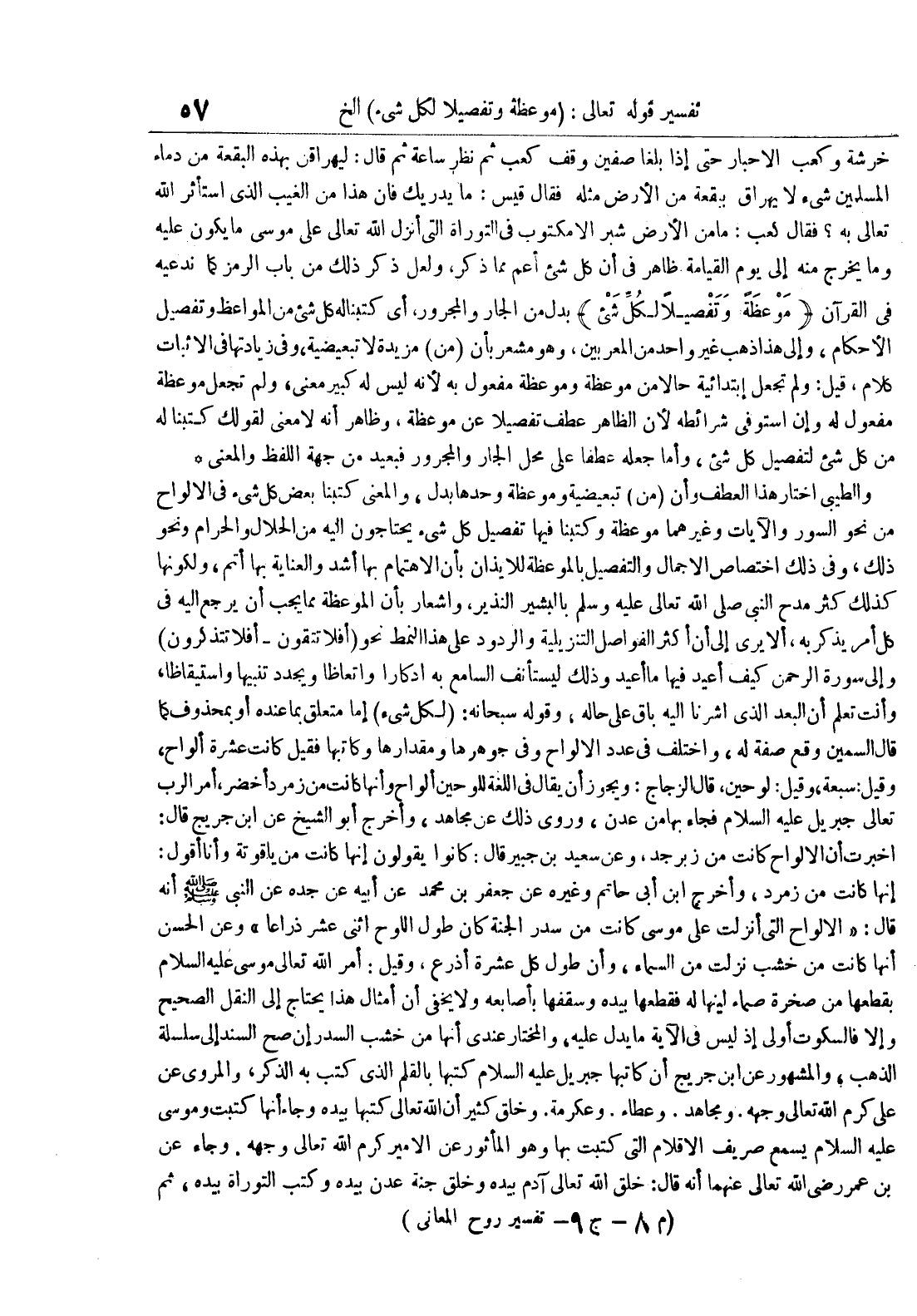 خرشة وكعب الأحبار حتى إذا بلغا صفين وقف كعب ثم نظر ساعة ثم قال : ليهراقن بهذه البقعة من دما المسلمين شيء لايهراق ببقعة من الأرض مثله فقال قيس : ما يدريك فإن هذا من الغيب الذي إستأثر الله تعالى به فقال كعب : مامن الأرض شبر إلا مكتوب في التوراة التي أنزل الله تعالى على موسى مايكون عليه وما يخرج منه إلى يوم القيامة ظاهر في أن كل شيء أعم مما ذكر ولعل ذكر ذلك من باب الرمز كما ندعيه في القرآن موعظة وتفصيلا لكل شيء بدل من الجار والمجرور أي كتبنا له كل شيء من المواعظ وتفصيل الأحكام وإلى هذا ذهب غير واحد من المعربين وهو مشعر بأن من مزيدة لا تبعيضية وفي زيادتها في الإثبات كلام قيل : ولم تجعل إبتدائية حالا من موعظة وموعظة مفعول به لأنه ليس له كبير معنى ولم تجعل موعظة مفعول له وإن إستوفى شرائطه لأن الظاهر عطف تفصيلا عن موعظة وظاهر أنه لامعنى لقولك كتبنا له من كل شيء لتفصيل كل شيء وأما جعله عطفا على محل الجار والمجرور فبعيد من جهة اللفظ والمعنى