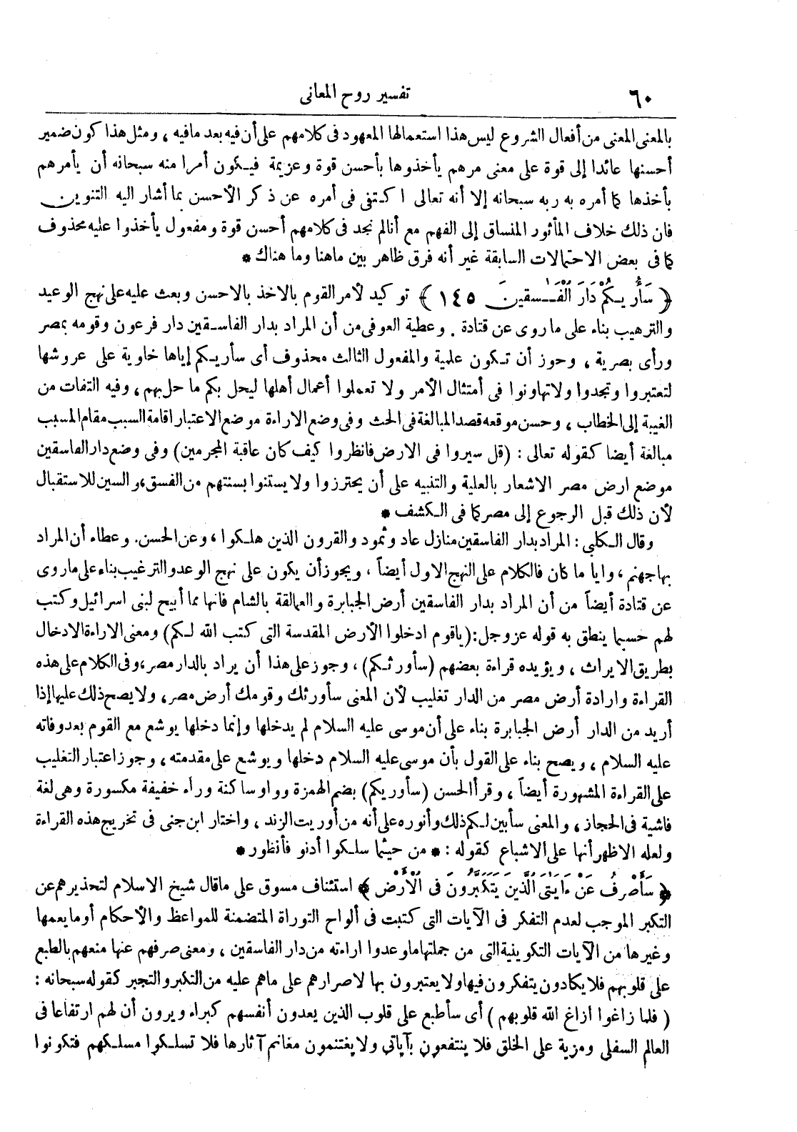 - توكيد لأمر القوم بالأخذ بالأحسن وبعث عليه على نهج الوعيد والترهيب بناء على ماروي عن قتادة وعطية العوفي من أن المراد بدار الفاسقين دار فرعون وقومه بمصر ورأى بصرية وجوز أن تكون علمية والمفعول الثالث محذوف أي سأريكم إياها خاوية على عروشها لتعتبروا وتجدوا ولا تهاونوا في إمتثال الأمر ولا تعملوا أعمال أهلها ليحل بكم ما حل بهم وفيه إلتفات من الغيبة إلى الخطاب وحسن موقعه قصد الميالغة في الحث وفي وضع الإراءة موضع الإعتبار إقامة السبب مقام المسبب مبالغة أيضا كقوله تعالى : قل سيروا في الأرض فانظروا كيف كان عاقبة المجرمين وفي وضع دار الفاسقين موضع أرض مصر الإشعار بالعلية والتنبيه على أن يحترزوا ولا يستنوا بسنتهم من الفسق والسين للإستقبال لأن ذلك قبل الرجوع إلى مصر كما في الكشف