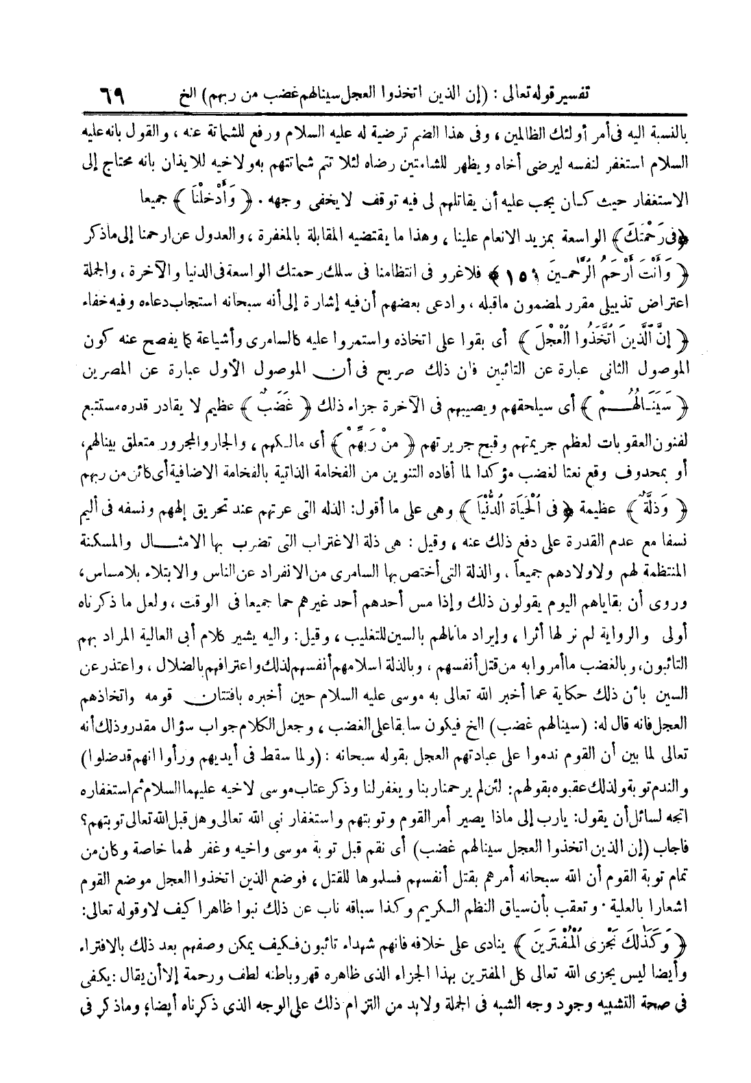 - فلا غرو في انتظامنا في سلك رحمتك الواسعة في الدنيا والآخرة والجملة اعتراض تذييلي مقرر لمضمون ما قبله وادعى بعضهم أن فيه إشارة إلى أنه سبحانه استجاب دعاءه وفيه خفاء إن الذين اتخذوا العجل أي بقوا على اتخاذه واستمروا عليه كالسامري وأشياعه كما يفصح عنه كون الموصول الثاني عبارة عن التائبين فإن ذلك صريح في أن الموصول الأول عبارة عن المصرين سينالهم أي سيلحقهم ويصيبهم في الآخرة جزاء ذلك غضب عظيم لا يقادر قدره مستتبع لفنون العقوبات لعظم جريمتهم وقبح جريرتهم من ربهم أي مالكهم والجار والمجرور متعلق بينالهم أو بمحذوف وقع نعتا لغضب مؤكدا لما أفاده التنوين من الفخامة الذاتية بالفخامة الإضافية أي كائن من ربهم وذلة عظيمة في الحياة الدنيا وهي على ما أقول : الذلة التي عرتهم عند تحريق إلههم ونسفه في اليم نسفا مع عدم القدرة على دفع ذلك عنه وقيل : هي ذلة الإغتراب التي تضرب بها الأمثال والمسكنة المنتظمة لهم ولأولادهم جميعا والذلة التي إختص بها السامري من الإنفراد عن الناس والإبتلاء بلا مساس وروي أن بقاياهم اليوم يقولون ذلك وإذا مس أحدهم أحد غيرهم حما جميعا في الوقت ولعل ما ذكرناه أولى والرواية لم نر لها أثرا وإيراد ما نالهم بالسين للتغليب وقيل : وإليه يشير كلام أبي العالية المراد بهم التائبون وبالغضب ما أمروا به من قتل أنفسهم وبالذلة إسلامهم أنفسهم لذلك واعترافهم بالضلال واعتذر عن السين بأن ذلك حكاية عما أخبر الله تعالى به موسى عليه السلام حين أخبره بإفتتان قومه واتخاذهم العجل فإنه قال له : سينالهم غضب الخ فيكون سابقا على الغضب وجعل الكلام جواب سؤال مقدر وذلك أنه تعالى لما بين أن القوم ندموا على عبادتهم العجل بقوله سبحانه : ولما سقط في أيديهم ورأوا أنهم قد ضلوا والندم توبة ولذلك عقبوه بقولهم : لئن لم يرحمنا ربنا ويغفر لنا وذكر عتاب موسى لأخيه عليهما السلام ثم إستغفاره اتجه لسائل أن يقول : يا رب إلى ماذا يصير أمر القوم وتوبتهم وإستغفار نبي الله تعالى وهل قبل الله تعالى توبتهم فأجاب إن الذين اتخذوا العجل سينالهم غضب أي نقم قبل توبة موسى وأخيه وغفر لهما خاصة وكان من تمام توبة القوم أن الله سبحانه أمرهم بقتل أنفسهم فسلموها للقتل فوضع الذين إتخذوا العجل موضع القوم إشعارا بالعلية وتعقب بأن سياق النظم الكريم وكذا سباقه ناب عن ذلك نبوا ظاهرا كيف لا وقوله تعالى : وكذلك نجزي المفترين ينادي على خلافه فإنهم شهداء تائبون فكيف يمكن وصفهم بعد ذلك بالإفتراء وأيضا ليس يجزي الله تعالى كل المفترين بهذا الجزاء الذي ظاهره قهر وباطنه لطف ورحمة إلا أن يقال : يكفي في صحة التشبيه وجود الشبه في الجملة ولابد من إلتزام ذلك على الوجه الذي ذكرناه أيضا وما ذكر في