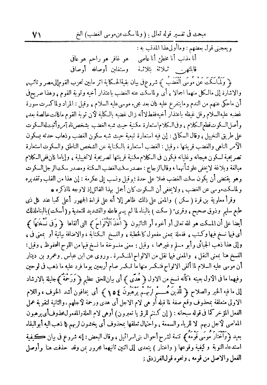 ويعجبني قول بعضهم : وما أولى هذا المذنب به : أنا مذنب أنا مخطيء أنا عاصي هو غافر هو أرحم هو عافي قابلتهن ثلاثة بثلاثة وستغلبن أوصافه أوصافي ولما سكت عن موسى الغضب شروع بيان بقية الحكاية أثر ما بين تحزب القوم إلى مصر وتائب وألإشارة إلى مالكل منهما إجمالا أي ولما سكت عنه الغضب بإعتذار أخيه وتوبة القوم وهذا صريح في أن ما حكي عنهم من الندم وما يتفرع عليه كان بعد مجيء موسى عليه السلام وقيل : المراد ولما كسرت سورة غضبه عليه السلام وقل غيظه بإعتذار أخيه فقط لا أنه زال غضبه بالكلية لأن توبة القوم ما كانت خالصة بعد وأصل السكوت قطع الكلام وفي الكلام إستعارة مكنية حيث شبه الغضب بشخص ناه آمر وأثبت له السكوت على طريق التخييل وقال السكاكي : إن فيه إستعارة تبعية حيث شبه سكون الغضب وذهاب حدته بسكون الآمر الناهي والغضب قرينتها وقيل : الغضب إستعارة بالكناية عن الشخص الناطق والسكوت إستعارة تصريحية لسكون هيجانه وغليانه فيكون في الكلام مكنية قرينتها تصريحية لا تخييلية وإياما كان ففي الكلام مبالغة وبلاغة لايخفى علو شأنهما وقال الزجاج : مصدر سكت الغضب والسكتة ومصدر سكت الرجل السكوت وهو يقتضي أن يكون سكت الغضب فعلا على حدة وقيل ونسب إلى عكرمة : إن هذا من القلب وتقديره ولما سكت موسى عن الغضب ولا يخفى أن السكوت كان أجمل بهذا القائل إذ لا وجه لما ذكره