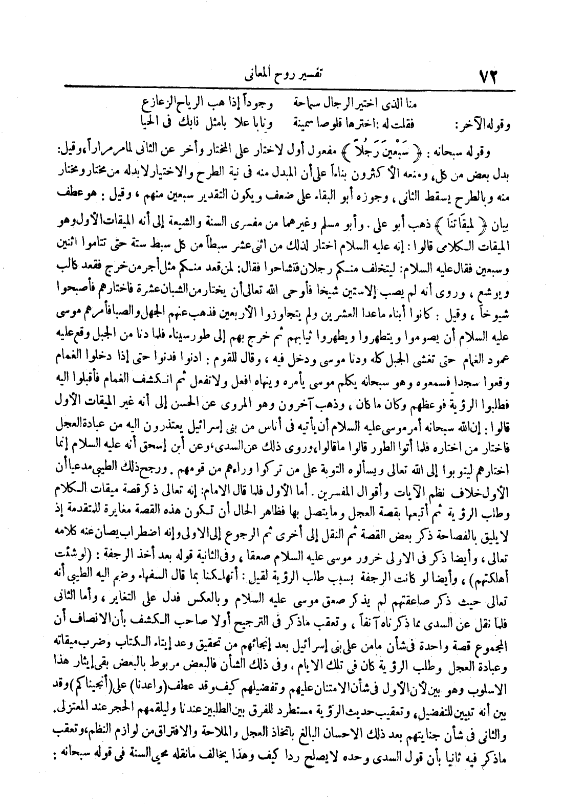 من الذي أختير الرجال سماحة وجودا إذا هب الرياح الزعازع وقوله الآخر فقلت له : اخترها قلوصا سمينة ونابا علا بأمثل نابك في الحيا وقوله سبحانه : سبعين رجلا مفعول أول لاختار على المختار وأخر عن الثاني لما مر مرارا وقيل : بدل بعض من كل ومنعه الأكثرون بناءا على أن المبدل منه في نية الطرح والإختيار لا بدله من مختار ومختار منه وبالطرح يسقط الثاني وجوزه أبو البقاء على ضعف ويكون التقدير سبعين منهم وقيل : هو عطف بيان لميقاتنا ذهب أبو علي وأبو مسلم وغيرهما من مفسري السنة والشيعة إلى أنه الميقات الأول وهو الميقات الكلامي قالوا : إنه عليه السلام إختار لذلك من اثني عشر سبطا من كل سبط ستة حتى تتاموا إثنين وسبعين فقال عليه السلام : ليختلف منكم رجلان فتشاحوا فقال : لمن قعد منكم مثل أجر من خرج فقعد كالب ويوشع وروي أنه لم يصب إلا ستين شيخا فأوحى الله تعالى أن يختار من الشبان عشرة فاختارهم فأصبحوا شيوخا وقيل : كانوا أبناء ماعدا العشرين ولم يتجاوزوا الأربعين فذهب عنهم الجهل والصبا فأمرهم موسى عليه السلام أن يصوموا ويتطهروا ويطهروا ثيابهم ثم خرج بهم إلى طور سيناء فلما دنا من الجبل وقع عليه عمود الغمام حتى تغشى الجبل كله ودنا موسى ودخل فيه وقال للقوم : ادنوا فدنوا حتى إذا دخلوا الغمام وقعوا سجدا فسمعوه وهو سبحانه يكلم موسى يأمره وينهاه افعل ولا تفعل ثم إنكشف الغمام فأقبلوا إليه فطلبوا الرؤية فوعظهم وكان ماكان وذهب آخرون وهو المروي عن الحسن إلى أنه غير الميقات الأول قالوا : إن الله سبحانه أمر موسى عليه السلام أن يأتيه في أناس من بني إسرئيل يعتذرون إليه من عبادة العجل فاختار من إختاره فلما أتوا الطور قالوا ماقالوا وروي ذلك عن السدي وعن ابن إسحق أنه عليه السلام إنما إختارهم ليتوبوا إلى الله تعالى ويسألوه التوبة على من تركوا وراءهم من قومهم ورجح ذلك الطيبي مدعيا أن الأول خلاف نظم الآيات وأقوال المفسرين أما الأول فلما قال الإمام : إنه تعالى ذكر قصة ميقات الكلام وطلب الرؤية ثم أتبعها بقصة العجل وما يتصل بها فظاهر الحال أن تكون هذه القصة مغايرة للمتقدمة إذ لا يليق بالفصاحة ذكر بعض القصة ثم النقل إلى أخرى ثم الرجوع إلى الأولى وإنه إضطراب يصان عنه كلامه تعالى وأيضا ذكر في الأولى خرور موسى عليه السلام صعقا وفي الثانية قوله بعد أخذ الرجفة : لو شئت أهلكتهم وأيضا لو كانت الرجفة بسبب طلب الرؤية لقيل : أتهلكنا بما قال السفهاء وضم إليه الطيبي أنه تعالى حيث ذكر صاعقتهم لم يذكر صعق موسى عليه السلام وبالعكس فدل على التغاير وأما الثاني فلما نقل عن السدي مما ذكرناه آنفا وتعقب ما ذكر في الترجيح أولا صاحب الكشف بأن الإنصاف أن المجموع قصة واحدة في شأن مامن على بني إسرائيل بعد إنجائهم من تحقيق وعد إيتاء الكتاب وضرب ميقاته وعبادة العجل وطلب الرؤية كان في تلك الأيام وفي ذلك الشأن فالبعض مربوط بالبعض بقي إيثار هذا الأسلوب وهو بين لأن الأول في شأن الإمتنان عليهم وتفضيلهم كيف وقد عطف واعدنا على أنجيناكم وقد بين أنه تبيين للتفضيل وتعقيب حديث الرؤية مستطرد للفرق بين الطلبين عندنا وليلقمهم الحجر عند المعتزلى والثاني في شأن جنايتهم بعد ذلك الإحسان البالغ بإتخاذ العجل والملاحة والإفتراق من لوازم النظم وتعقب ماذكر فيه ثانيا بأن قول السدي وحده لايصلح ردا كيف وهذا يخالف ما نقله محيي السنة في قوله سبحانه :