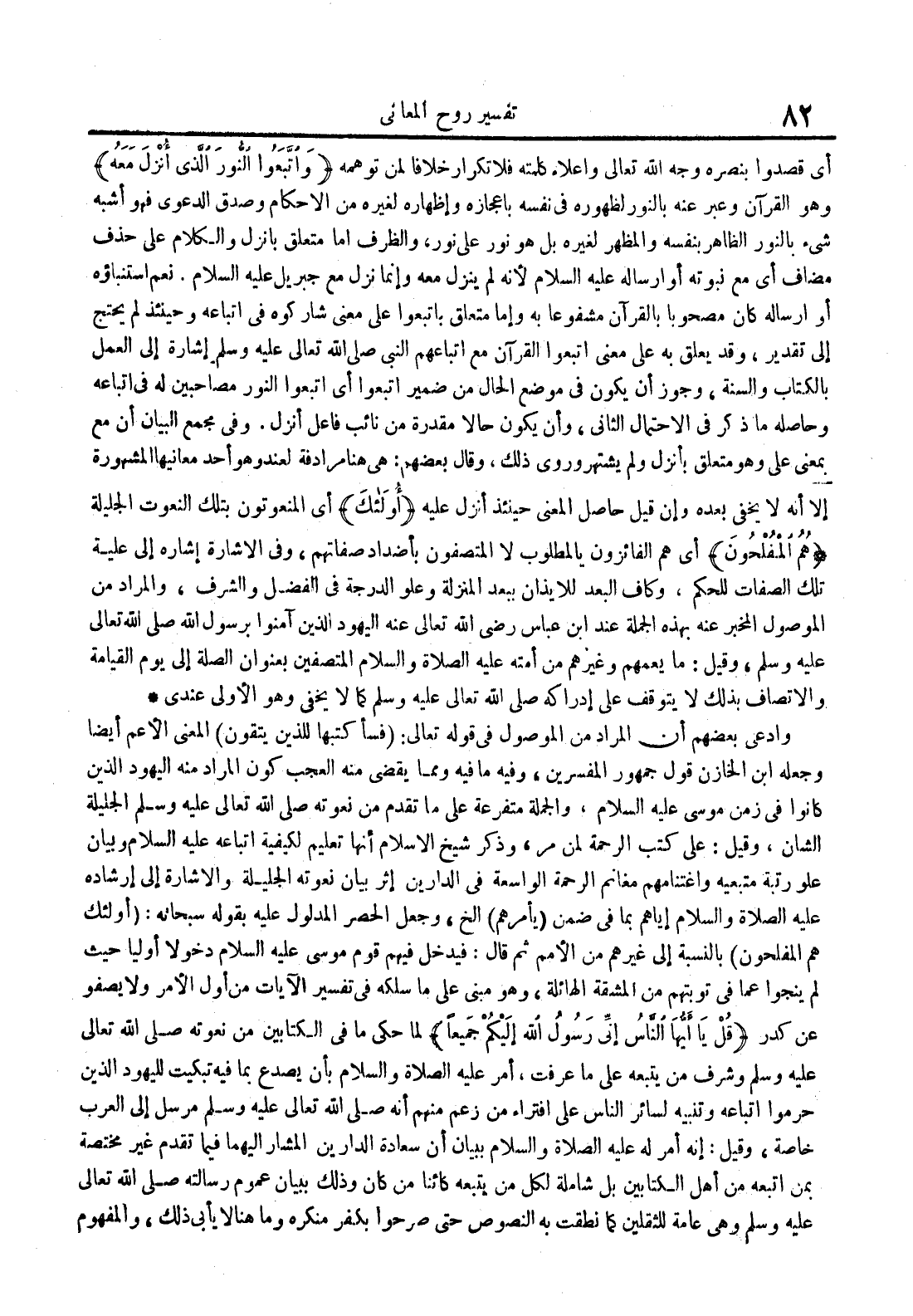 أي قصدوا بنصره وجه الله تعالى وإعلاء كلمته فلا تكرار خلافا لمن توهمه واتبعوا النور الذي أنزل معه وهو القرآن وعبر عنه بالنور لظهوره في نفسه بإعجازه وإظهاره لغيره من الأحكام وصدق الدعوى فهو أشبه شيء بالنور الظاهر بنفسه والمظهر لغيره بل هو نور على نور والظرف إما متعلق بإنزل والكلام على حذف مضاف أي مع نبوته أو إرساله عليه السلام لأنه لم ينزل معه وإنما نزل مع جبريل عليه السلام نعم إستنباؤه أو إرساله كان مصحوبا بالقرآن مشفوعا به وإما متعلق باتبعوا على معنى شاركوه في إتباعه وحينئذ لم يحتج إلى تقدير وقد يعلق به على معنى اتبعوا القرآن مع إتباعهم النبي صلى الله تعالى عليه وسلم آشارة إلى العمل بالكتاب والسنة وجوز أن يكون في موضع الحال من ضمير اتبعوا أي اتبعوا النور مصاحبين له في إتباعه وحاصله ما ذكر في الإحتمال الثاني وأن يكون حالا مقدرة من نائب فاعل أنزل وفي مجمع البيان أن مع بمعنى على وهو متعلق بأنزل ولم يشتهر وروى ذلك وقال بعضهم : هي هنا مرادفة لعند وهو أحد معانيها المشهورة إلا أنه لا يخفى بعده وإن قيل حاصل المعنى حينئذ أنزل عليه أولئك أي المنعوتون بتلك النعوت الجليلة هم المفلحون أي هم الفائزون بالمطلوب لا المتصفون بأضداد صفاتهم وفي الإشارة إشارة إلى علية تلك الصفات للحكم وكاف البعد للإيذان ببعد المنزلة وعلو الدرجة في الفضل والشرف والمراد من الموصول المخبر عنه بهذه الجملة عند ابن عباس رضي الله تعالى عنه اليهود الذين آمنوا برسول الله صلى الله تعالى عليه وسلم وقيل : ما يعمهم وغيرهم من أمته عليه الصلاة و السلام المتصفين بعنوان الصلة إلى يوم القيامة والإتصاف بذلك لا يتوقف على إدراكه صلى الله تعالى عليه وسلم كما لايخفى وهو الأولى عندي
