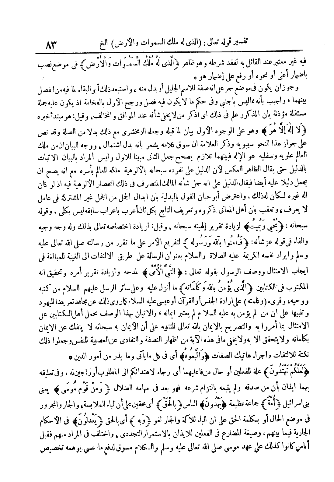 وجوز أن يكون في موضع جر على أنه صفة للإسم الجليل أو بدل منه واستبعد ذلك أبو البقاء لما فيه من الفصل بينهما وأجيب بأنه مما ليس بأجنبي وفي حكم ما لايكون فيه فصل ورجح الأول بالفخامة إذ يكون عليه جملة مستقلة مؤذنة بأن المذكور علم في ذلك أي اذكر من لا يخفى شأنه عند الموافق والمخالف وقيل : هو مبتدأ خبره لا إله إلا هو وهو على الوجوه الأول بيان لما قبله وجعله الزمخشري مع ذلك بدلا من الصلة وقد نص على جواز هذا النحو سيبويه وذكر العلامة أن سوق كلامه يشعر بأنه بدل إشتمال ووجه البيان أن من ملك العالم علويه وسفليه هو الإله فبينهما تلازم يصحح جعل الثاني مبينا للأول وليس المراد بالبيان الإثبات بالدليل حتى يقال الظاهر العكس لأن الدليل على تفرده سبحانه بالألوهية ملكه للعالم بأسره مع أنه يصح أن يجعل دليلا عليه أيضا فيقال الدليل على أنه جل شأنه المالك المتصرف في ذلك إنحصار الألوهية فيه إذ لو كان إله غيره لكان له ذلك واعترض أبو حيان القول بالبدلية بأن إبدال الجمل من الجمل غير المشتركة في عامل لا يعرف وتعقب بأن أهل المعاني ذكروه وتعريف التابع بكل ثان أعرب بإعراب سابقه ليس بكلي وقوله سبحانه : يحيي ويميت لزيادة تقرير إلهيته سبحانه وقيل : لزيادة إختصاصه تعالى بذلك وله وجه وجيه والفاء في قوله عز شأنه : فآمنوا بالله ورسوله لتفريع الأمر على ما تقرر من رسالته صلى الله تعالى عليه وسلم وإيراد نفسه الكريمة عليه الصلاة و السلام بعنوان الرسالة على طريق الإلتفات إلى الغيبة للمبالغة في إيجاب الإمتثال ووصف الرسول بقوله تعالى : النبي الأمي لمدحه ولزيادة تقرير أمره وتحقيق أنه المكتوب في الكتابين الذي يؤمن بالله وكلماته ماأنزل عليه وعلى سائر الرسل عليهم السلام من كتبه ووحيه وقريء وكلمته على إرادة الجنس أو القرآن أو عيسى عليه السلام كما روي ذلك عن مجاهد تعريضا لليهود وتنبيها على أن من لم يؤمن به عليه السلام لم يعتبر إيمانه والإتيان بهذا الوصف بحمل أهل الكتابين على الإمتثال بما أمروا به والتصريح بالإيمان بالله تعالى للتنبيه على أن الإيمان به سبحانه لا ينفك عن الإيمان بكلماته ولا يتحقق إلا به ولا يخفى ما في هذه الآية من إظهار الصفة والتفادي عن العصبية للنفس وجعلوا ذلك نكتة للإلتفات وإجراء هاتيك الصفات واتبعوه أي في كل ما يأتي وما يذر من أمور الدين
