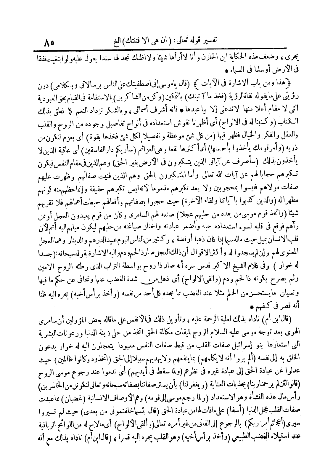 فإنه أشرف أسمائي وبالشكر تزداد النعم كما ينطق بذلك الكتاب وكتبنا له في الألواح أي أظهرنا نقوش إستعداده في ألواح تفاصيل وجوده من الروح والقلب والعقل والفكر والخيال فطهر فيها من كل شيء موعظة وتفصيلا لكل شيء فخذها بقوة أي بعزم لتكون من ذويه وأمر قومك يأخذوا بأحسنها أي أكثرها نفعا وهي العزائم سأريكم دار الفاسقين أي عاقبة الذين لايأخذون بذلك سأصرف عن آياتي الذين يستكبرون في الأرض بغير الحق وهم الذين في مقام النفس فيكون تكبرهم حجابا لهم عن آيات الله تعالى وأما المتكبرون بالحق وهم الذين فنيت صفاتهم وظهرت عليهم صفات مولاهم فليسوا بمجوبين ولا يعد تكبرهم مذموما لأنه ليس تكبرهم حقيقة وإنما حظهم منه كونهم مظهرا له والذين كذبوا بآياتنا ولقاء الآخرة حيث حجبوا بصفاتهم وأفعالهم حبطت أعمالهم فلا تقربهم شيئا واتخذ قوم موسى من بعده من حليهم عجلا صنعه لهم السامري وكان من قوم يعبدون العجل أو ممن رآهم فوقع في قلبه لسوء إستعداده حبه وأضمر عبادته واختار صياغته من حليهم ليكون ميلهم إليه أتم لأن قلب الإنسان يميل حيث ماله سيما إذا كان ذهبا أو فضة وكثير من الناس اليوم عبيد الدراهم والدينار وهما العجل المعنوي لهم وإن لم يسجدوا له وأكثر الأقوال أن ذلك العجل صار ذا لحم ودم وإليه الإشارة بقوله سبحانه : جسدا له خوار وفي كلام الشيخ الأكبر قدس سره أنه صار ذا روح بواسطة التراب الذي وطئه الروح الأمين ولم يصرح بكونه ذا لحم ودم وألقى الألواح أي ذهل من شدة الغضب عنها وتجافي عن حكم ما فيها ونسيان ما يستحسن من الحلم مثلا عند الغضب مما يجده كل أحد من نفسه وأخذ برأس أخيه يجره إليه ظنا أنه قصر في كفهم