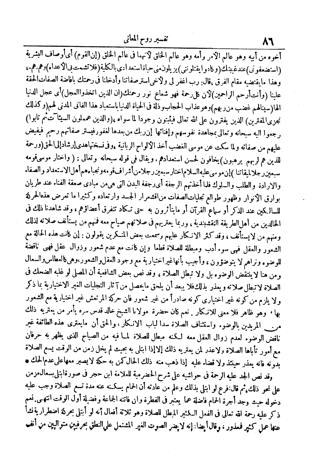 أخوه من أبيه وهو عالم الأمر وأمه وهو عالم الخلق لأنهما في عالم الخلق إن القوم أي أوصاف البشرية إستضعفوني عند غيبتك وكادوا يقتلونني يزيلون من حياة إستعدادي بالكلية فلا تشمت بي الأعداء وهم هم وهذا ما يقتضيه مقام الفرق قال : رب اغفر لي ولأخي استر صفاتنا وأدخلنا في رحمتك بإفاضة الصفات الحقة علينا وأنت أرحم الراحمين لأن كل رحمة فهو شعاع نور رحمتك إن الذين اتخذوا العجل أي عجل الدنيا إلها سينالهم غضب من ربهم وهو عذاب الحجاب وذلة في الحياة الدينا بإسعباد هذا الفاني المدني لهم وكذلك نجزي المفترين الذين يفترون على الله فيثبتون وجودا لما سواه والذين عملوا السيئات ثم تابوا رجعوا إليه سبحانه وتعالى بمجاهدة نفوسهم وإفنائها إن ربك من بعدها لغفور فيستر صفاتهم رحيم فيفيض عليهم من صفاته ولما سكت عن موسى الغضب أخذ الألواح الربانية وفي نسختها هدى إرشاد إلى الحق ورحمة للذين هم لربهم يرهبون يخافون لحسن إستعدادهم ويقال في قوله سبحانه وتعالى : واختار موسى قومه سبعين رجلا لميقاتنا إن موسى عليه السلام اختار سبعين رجلا من أشراف قومه ونجباءهم أهل الإستعداد والصفاء والإرادة والطلب والسلوك فلما أخذتهم الرجفة أي رجفة البدن التي هي من مبادي صعقة الفناء عند طريان بوارق الأنوار وظهور طوالع تجليات الصفات من اقشعرار الجسد وارتعاده وكثيرا ما تعرض هذه الحركة للسالكين عند الذكر أو سماع القرآن أو ما يتأثرون به حتى تكاد تتفرق أعضائهم وقد شاهدنا ذلك في الخالدين من أهل الطريقة النقشبندية وربما يعتريهم في صلاتهم صياح معه فمنهم من يستأنف صلاته لذلك ومنهم من لا يستأنف وقد كثر الإنكار عليهم وسمعت بعض المنكرين يقولون : إن كانت هذه الحالة مع الشعور والعقل فهي سوأ أدب ومبطلة للصلاة قطعا وإن كانت مع عدم شعور وزوال عقل فهي ناقضة للوضوء ونراهم لايتوضؤون وأجيب بأنها غير اختيارية مع وجود العقل والشعور وهي كالعطاس والسعال ومن هنا لاينتقض الوضوء بل ولا تبطل الصلاة وقد نص بعض الشافعية أن المصلي لو غلبه الضحك في الصلاة لاتبطل صلاته ويعذر بذلك فلا يبعد أن يلحق ما يحصل من آثار التجليات الغير الإختيارية بما ذكر ولا يلزم من كونه غير إختياري كونه صادرا من غير شعور فإن حركة المرتعش غير إختيارية مع الشعور بها وهو ظاهر فلا معنى للإنكار نعم كان حضرة مولانا الشيخ خالد قدس سره يأمر من يعتريه ذلك من المريدين بالوضوء وإستئناف الصلاة سدا لباب الإنكار والحق أن ما يعتري هذه الطائفة غيرناقض للوضوء لعدم زوال العقل معه لكنه مبطل للصلاة لما فيه من الصياح الذي يظهر به حرفان مع أمور تأباها الصلاة ولا عذر لمن يعتريه ذلك إلا إذا ابتلي به بحيث لم يخل زمن من الوقت يسع الصلاة بدونه فإنه يعذر حينئذ ولا قضاء عليه إذا ذهب منه ذلك الحال كمن به حكة لايصبر معها على عدم الحك