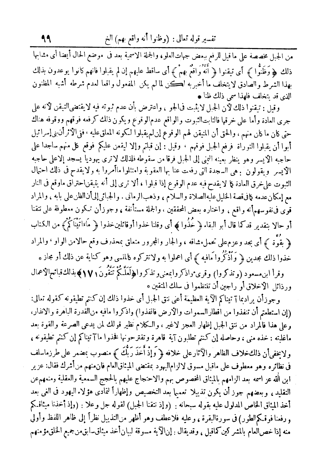 وقيل : تيقنوا ذلك لأن الجبل لايثبت في الجو واعترض بأن عدم ثبوته فيه لايقتضي التيقن لأنه على جري العادة وأما على خرقها فالثابت الثبوت والواقع عدم الوقوع ويكون ذلك كرفعه فوقهم ووقوفه هناك حتى كان ما كان منهم والحق أن المتيقن لهم الوقوع إن لم يقبلوا لكونه المعلق عليه ففي الأثر أن بني إسرائيل أبوا أن يقبلوا التوراة فرفع الجبل فوقهم وقيل : إن قبلتم وإلا ليقعن عليكم فوقع كل منهم ساجدا على حاجبيه الأيسر وهو ينظر بعينه اليمنى إلى الجبل فرقا من سقوطه فلذلك لاترى يهوديا يسجد إلا على حاجبه الأيسر ويقولون : هي السجدة التي رفعت عنا بها العقوبة وامتثلوا ماأمروا به ولا يقدح في ذلك إحتمال الثبوت على خرق العادة كما لايقدح فيه عدم الوقوع إذا قبلوا ألا ترى إلى أنه يتيقن احتراق ما وقع في النار مع إمكان عدمه كما في قصة الخليل عليه الصلاة و السلام وذهب الرماني والجبائي إلى أن الظن على بابه والمراد قوي في نفوسهم أنه واقع واختاره بعض المحققين والجملة مستأنفة وجوز أن تكون معطوفة على نتقنا أو حالا بتقدير قد كما قال أبو البقاء خذوا أي وقلنا خذوا أو قائلين خذوا ماءآتيناكم من الكتاب بقوة أي بجد وعزم على تحمل مشاقه والجار والمجرور متعلق بمحذوف وقع حالا من الواو والمراد خذوا ذلك مجدين واذكروا ما فيه أي اعملوا به ولا تتركوه كالمنسي وهو كناية عن ذلك أو مجاز