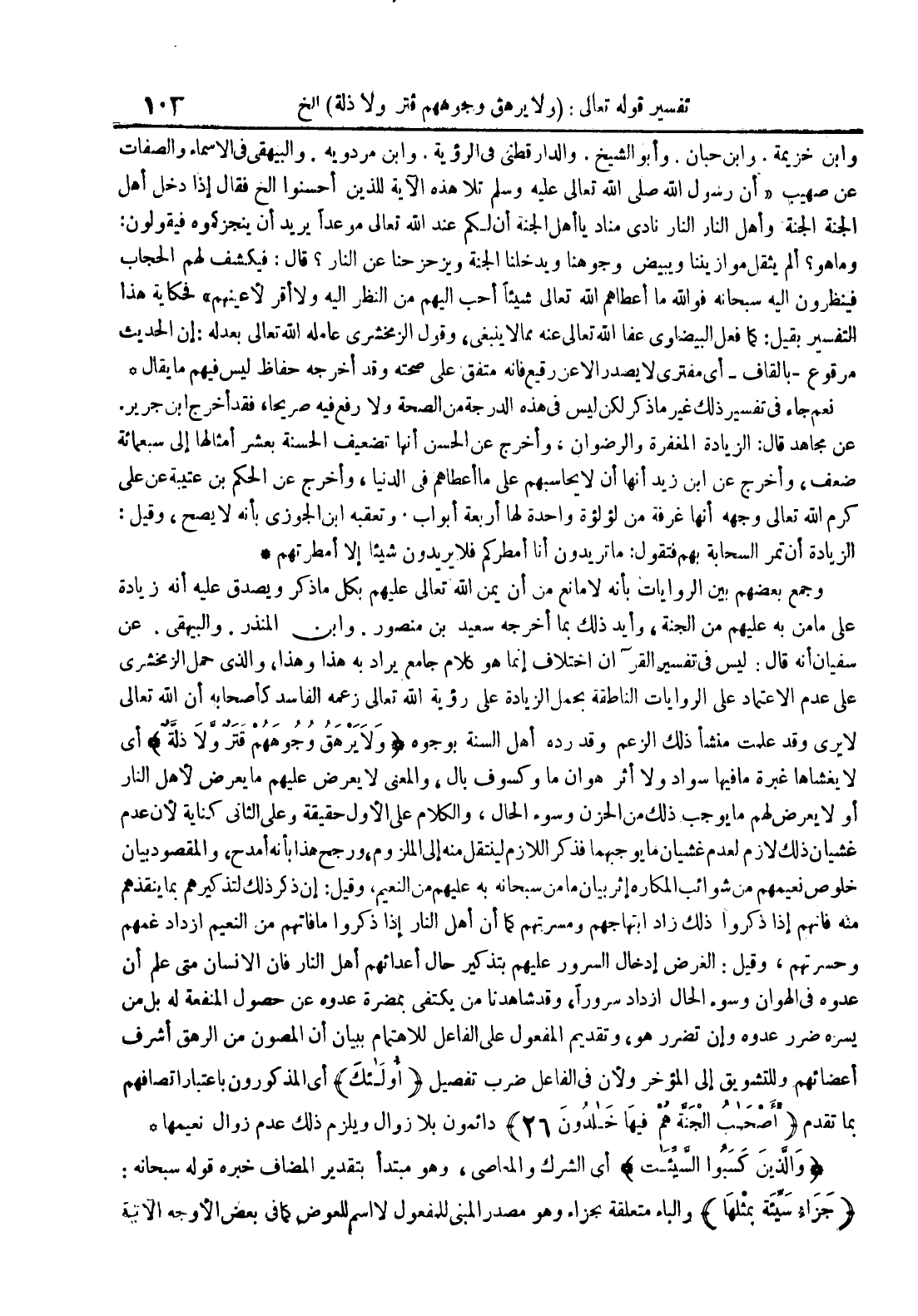 وابن خزيمة وابن حيان وأبو الشيخ والدارقطني وابن مردويه والبيهقي في الأسماء والصفات عن صهيب أن رسول الله صلى الله تعالى عليه وسلم تلا هذهالآية للذين أحسنوا إلخ فقال إذا دخل أهل الجنة الجنة وأهل النارالنار نادى مناد يا أهل الجنة أن لكم عند الله تعالى موعدا يريد أنينجزكموه فيقولون : وما هو ألم يثقل موازيننا ويبيض وجوهنا ويدخلنا الجنة ويزحزحنا عن النار قال : فيكشف لهم الحجاب فينظرون إليه سبحانه فوالله ما أعطاهم الله تعالى شيئا أحب إليهم من النظر إليه ولا أقر لأعينهم فحكاية هذا التفسير بقيل : كما فعل البيضاوي عفا الله تعالى عنه مما لا ينبغي وقول الزمخشري عامله الله تعالى بعدله : إن الحديث مرقوع بالقاف أي مفترى لا يصدر إلا عن رقيع فإنه متفق على صحته وقد أخرجه حفاظ ليس فيهم ما يقال