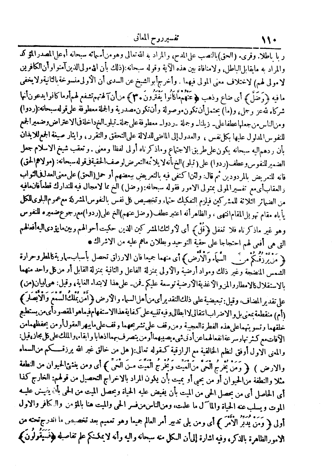 ربا باطلا وقرىء الحق بالنصب على المدح والمراد به الله تعالى وهو من أسمائه سبحانه أو على المصدر المؤكد والمراد به ما يقابل الباطل ولا منافاة بين هذه الآية وقوله سبحانه : ذلك بأن الله مولى الذين آمنوا وأن الكافرين لا مولى لهم لإختلاف معنى المولى فيهما وأخرج الشيخ عن السدي أن الأولى منسوخة بالثانية ولا يخفى ما فيه وضل أي ضاع وذهب عنهم ماكانوا يفترون 30 من أن آلهتهم تشفع لهم أو ما كانوا يدعون أنها شركاء لله عز و جل و ما يحتمل أن تكون موصولة وأن تكون مصدرية والجملة معطوفة على قوله سبحانه : ردوا ومنالناس من جعلها عطفا على زيلنا وجملة ردوا معطوفة على جملة تبلو إلخ داخلة في الإعتراض و ضمير الجمع للنفوس المدلول عليها بكل نفس والعدول إلى الماضي للدلالة على التحقق والتقرر وإيثار صيغة الجمع للإيذان بأن ردهم إليه سبحانه يكون على طريق الإجتماع وما ذكرناه أولى لفظا ومعنى وتعقب شيخ الإسلام جعل الضمير للنفوس وعطف ردوا على تبلو إلخ بأنه لا يلائمه التعرض لوصف الحقية في قوله سبحانه : مولاهم الحق فانه للتعريض بالمردودين ثم قال : ولئن إكتفى فيه بالتعريض ببعضهم أو حمل الحق على معنى العدل في الثواب والعقاب أي مو تفسير المولى بمتولي الأمور فقوله سبحانه : وضل إلخ مما لا مجال فيه للتدارك قطعا فإن ما فيه من الضمائر الثلاثة للمشركين فيلزم التفكيك حتما وتخصيص كل نفس بالنفوس المشركة مع عموم البلوى للكل يأباه مقام تهويل المقام إنتهى والظاهر أنه إعتبر عطف وضل عنهم إلخ على ردوا مع رجوع ضميره للنفوس وهنو غير ما ذكرناه فلا تغفل قل أي لأولئك المشركين الذين حكيت أحوالهم وبين ما يؤدي إليهأفعالهم التي هي أفعى لهم إحتجاجا على حقية التوحيد وبطلان ماهم عليه من الإشراك