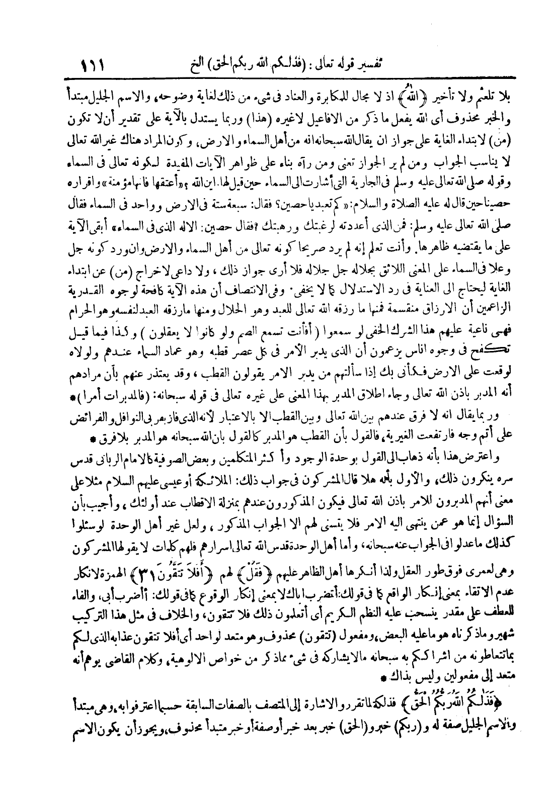 وإعترض هذا بأنه ذهاب إلى القول بوحدة الوجود وأكثر المتكلمين وبعض الصوفية كالإمام الرباني قدس سره ينكرون ذلك والأول بأنه هلاالمشركون في جواب ذلك : الملائكة أو عيسى عليهم السلام مثلا على معنى أنهم المدبرون للأمر بإذن الله تعالى فيكون المذكورون عندهم بمنزلة الأقطاب عند أولئك وأجيب بأن السؤال إنما هو عمن ينتهي إليه الأمر فلا يتسنى لهم إلا الجواب المذكور ولعل غير أهل الوحدة لو سئلوا كذلك ما عدلوا في الجواب عنه سبحانه وأما أهل الوحدة قدس الله تعالى أسرارهم فلهم كلمات لا يقولها المشركون وهي لعمري فوق طور العقل ولذا أنكرها أهل الظاهر عليهم فقل لهم أفلا تعقلون 31 الهمزة لإنكار عدم الإتقاء بمعنى إنكار الواقع كما في قولك : أتضرب أباك لا بمعنى إنكار الوقوع كما في قولك : أأضرب أبي والفاء للعطف على مقدر ينسحب عليه النظم الكريم أي أتعلمون ذلك فلا تتقون والخلاف في مثل هذا التركيب شهير وما ذكرناه هو ما عليه البعض ومفعول تتقون محذوف وهو متعد لواحد أي أفلا تتقون عذابه الذي لكم بما تتعاطونه من إشراككم به سبحانه ما لا يشاركه في شيء مما ذكر من خواص الألوهية وكلام القاضي يوهم أنه متعد إلى مفعولين وليس بذاك