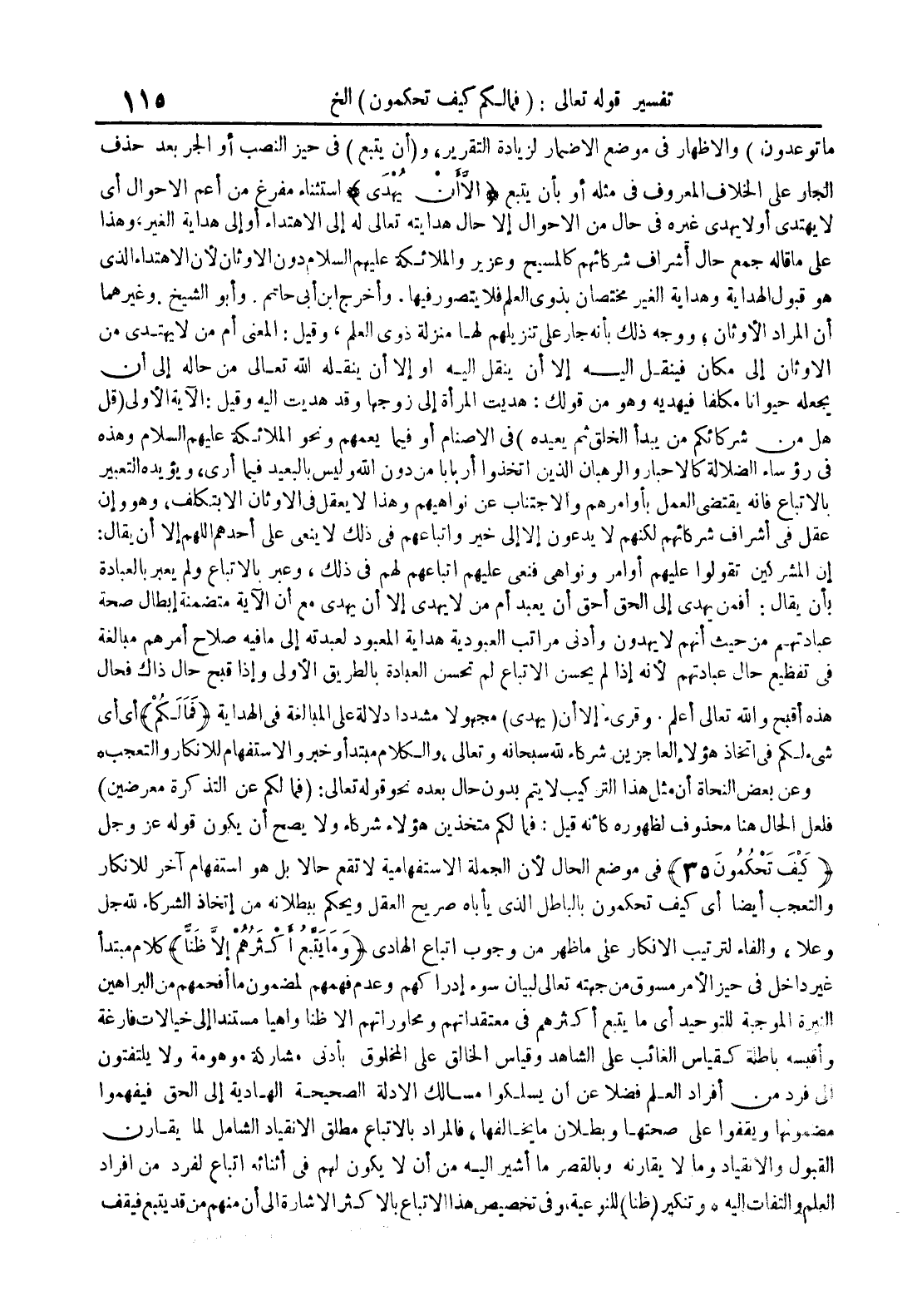 وعن بعض النحاة أن مثل هذا التركيب لا يتم بدون حال بعده نحو قوله تعالى : فما لكم عن التذكرة معرضين لعل الحال هنا محذوف لظهوره كأنه قيل : فما لكم متخذين هؤلاء شركاء ولا يصح أن يكون قوله عز و جل كيف تحكمون 35 في موضع الحال لأن الجملة الإستفهامية لا تقع حالا بل هو إستفهام آخر للإنكار التعجب أيضا أي كيف تحكمون بالباطل الذي يأباه صريح العقل ويحكم ببطلانه من إتخاذ الشركاء لله جلا وعلا والفاء لترتيب الإنكار على ما ظهر من وجوب إتباع الهادي ومايتبع أكثرهم إلا ظنا كلام مبتدأ غير داخل في حيز الأمر مسوق من جهته تعالى لبيان سوء إدراكهم وعدم فهمهم لمضمون ما أفحمهم من البراهين النيرة الوجبة للتوحيد أي ما يتبع أكثرهم في معتقداتهم ومحاوراتهم إلا ظنا واهيا مستندا إلى خيالات فارغة وأقيسه باطلة كقياس الغائب على الشاهد وقياس الخالق على المخلوق بأدنى مشاركة موهومة ولا يلتفتون لي فرد من أفراد العلم فضلا عن أن يسلكوا مسالك الأدلة الصحيحة الهادية إلى الحق فيفهموا مضمونها ويقفوا على صحتها وبطلان ما يخالفها فالمراد بالاتباع مطلق الإنقياد الشامل لما يقارن القبول والإنقياد وما لايقارنه وبالقصر ما أشير اليه من أن لايكون لهم في أثنائه إتباع لفرد من أفراد العلم والتفات إليه