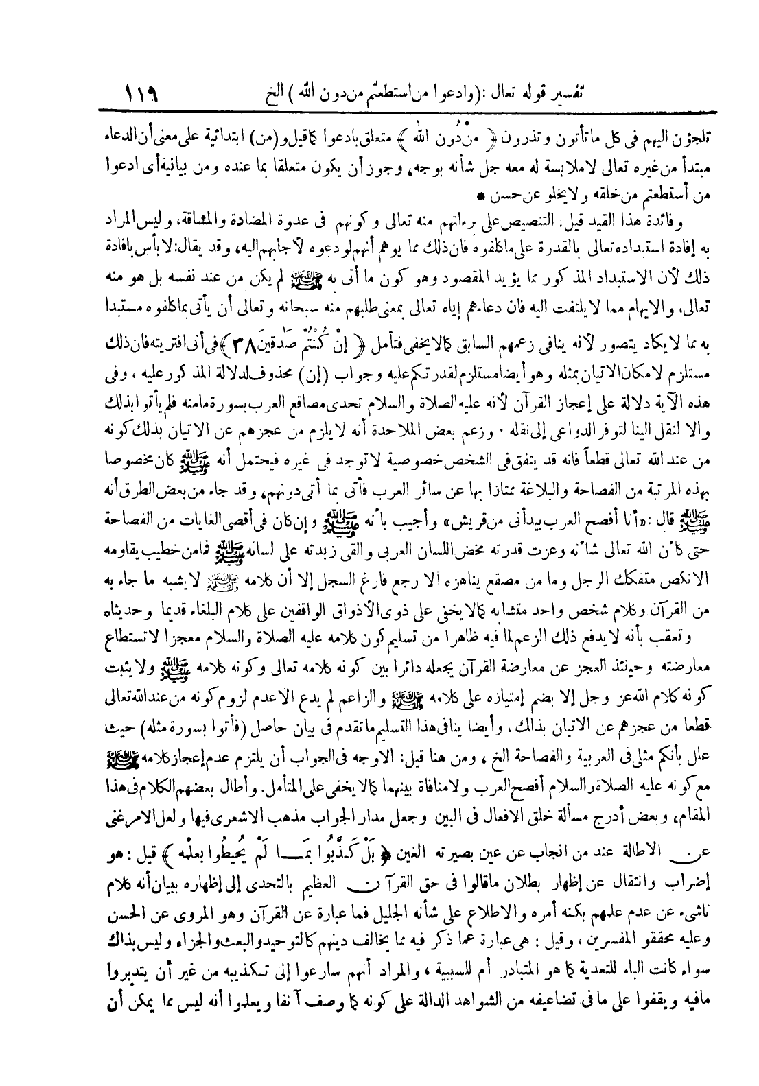 وفائدة هذا القيد قيل : التنصيص على براءتهم منه تعالى وكونهم في عدوة المضادة والمشاقة وليس المراد به إفادة إستبداده تعالى بالقدرة على ما كلفوه فإن ذلك مما يوهم أنهم لو دعوه لأجابهم إليه وقد يقال : لا بأس بإفادة ذلك لأن الإستبداد المذكور مما يؤيد المقصود وهو كون ماأتى به صلى الله عليه و سلم لم يكن من عند نفسه بل هو منه تعالى والإيهام مما لا يلتفت إليه فإن دعاءهم إياه تعالى بمعنى طلبهم منه سبحانهوتعالى أن يأتي بما كلفوه مستبدا به مما لا يكاد يتصور لأنه ينافي زعمهم السابق كما لا يخفى فتأمل إن كنتم صدقين 38 في أني إفتريتهفإن ذلك مستلزم لإمكان الإتيان بمثله وهو أيضا مستلزم لقدرتكم عليه وجواب إن محذوف لدلالة المذكور عليه وفي هذه الآية دلالة على إعجازالقرآن لأنه عليه الصلاة و السلام تحدى مصاقع العرب بسورة ما منه فلميأتوا بذلك وإلا لنقل إلينا لتوفر الدواعي إلى نقله وزعم بعض الملاحدة أنه لا يلزم من عجزهم عن الإتيان بذلك كونه من عند الله تعالىقطعا فانه قد يتفق في الشخص خصوصية لا توجد في غيره فيحتمل أنه صلى الله عليه و سلم كان مخصوصا بهذه المرتبة من الفصاحة والبلاغة ممتازا بها عن سائر العرب فأتى بما أتى دونهم وقد جاء من بعض الطرق أنه صلى الله عليه و سلم قال : أنا أفصح العرب بيد أني من قريش وأجيب بأنه صلى الله عليه و سلم وإن كان في أقصى الغايات من الفصاحة حتى كأن الله تعالى شأنه وعزت قدرته مخض اللسان العربي والقى زبدته على لسانه صلى الله عليه و سلم فما من خطيب يقاومه إلا نكص متفكك الرجل وما من مصقع يناهره إلا رجع فارغ السجل إلا أن كلامه صلى الله عليه و سلم لا يسبهما جاء به من القرآن وكلام شخص واحد متشابه كما لا يخفى على ذوي الأذواق الواقفين على كلام البلغاء قديما وحديثا
