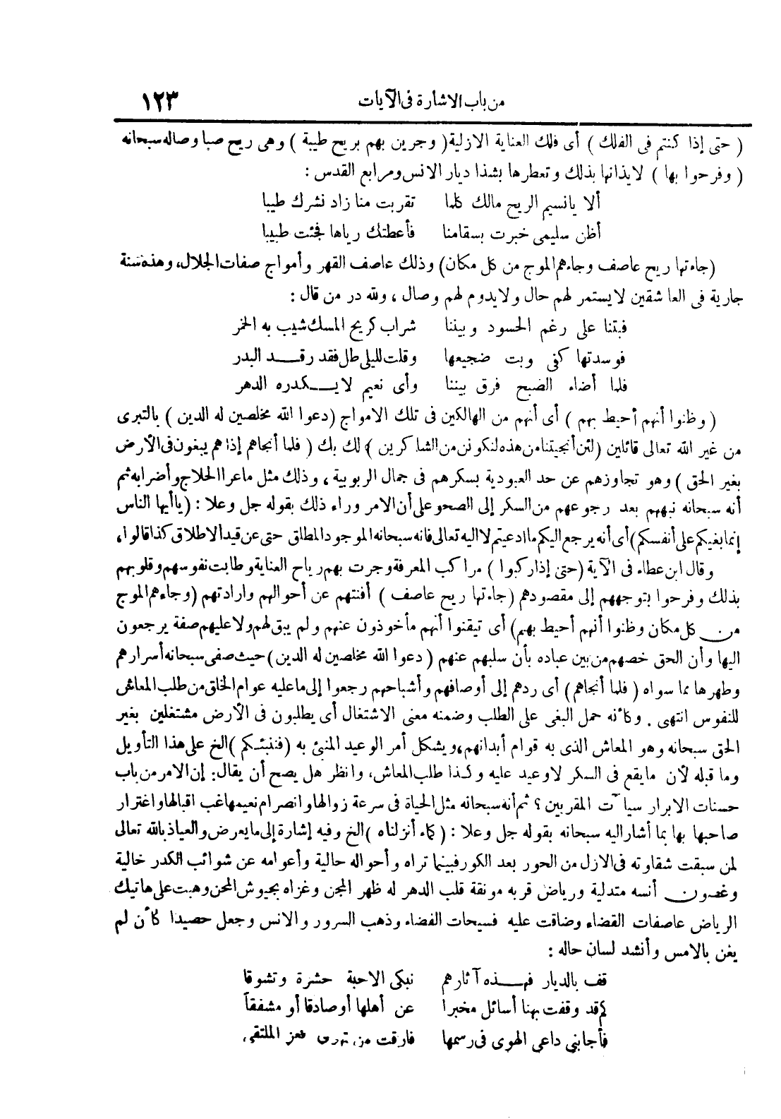 حتى إذا كنتم في الفلك أي فلك العناية الأزلية وجرين بهم بريحطيبة وهي ريح صبا وصاله سبحانه وفرحوا بها لإيذانها بذلك وتعطرهابشذا ديار الأنس ومرابع القدس : ألا يا نسيم الريح مالك كلما تقربت منا زاد نشرك طيبا أظن سليمي خبرت بسقامنا فأعطتك رياها فجئت طبيبا جاءتها ريح عاصف وجاءهم الموج من كل مكان وذلك عاصف القهر وأمواج صفات الجلال وهذه سنة جارية في العاشقين لا يستمر لهم حال ولا يدوملهم وصال ولله در من قال : فبتنا على رغم الحسود وبيننا شراب كريح المسك شيب به الخمر فوسدتها كفى وبت ضجيعها وقلت لليلي طل فقد رقد البدر فلما أضاء الصبح فرق بيننا وأي نعيم لا يكدره الدهر وظنوا أنهم أحيط بهم أي أنهم من الهالكين في تلك الأمواج دعواالله مخلصين له الدين بالتبري من غير الله تعالى قائلين لئنأنجيتنا من هذه لنكونن من الشاكرين لك بك فلما أنجاهم إذا هم يبغونفي الأرض بغيرالحق وهو تجاوزهم عن حد العبودية بسكرهم في جمالالربوبية وذلك مثل ما عر الحلاج وإضرابه ثم أنه سبحانه نبههم بعد رجوعهم من السكر إلى الصحو على أن الأمر وراء ذلك بقوله جل وعلا : يا أيها الناس إنما بغيكم على أنفسكم أي أنه يرجع إليكم ما إدعيتم لا إليه تعالى فإنه سبحانه الموجود المطلق حتى عن قيد الإطلاق كذا قالوا وقال ابن عطاء في الآية حتى إذا ركبوا مراكب المعرفة وجرت بهم رياح العناية وطابت نفوسهم وقلوبهم بذلك وفرحوا بتوجههم إلىمقصودهم جاءتها ريح عاصف أفنتهم عن أحوالهم وإرادتهم وجاءهم الموج من كل مكان وظنوا أنهم أحيط بهم أي تيقنوا أنهم مأخوذون عنهم ولم يبق لهم ولا عليهم صفة يرجعون إليها وأن الحق خصهم من بينعباده بأن سلبهم عنهم دعوا الله مخلصين له الدين حيث صفى سبحانه أسرارهم وطهرها مما سواه فلما أنجاهم أي ردهم إلى أوصافهم أشباحه رجعوا إلى ما عليه عوام الخلق من طلب المعاش للنفوس إنتهى وكأنه حمل البغي على الطلب وضمنه معنى الإشتغال أي يطلبون في الأرض مشتغلين بغير الحق سبحانه وهو المعاش الذي به قوام أبدانهم ويشكلأمر الوعيد المنبئ به فننبئكم إلخ على هذا التأويل وما قبله لأنما يقع في السكر لا وعيد عليه وكذا طلب المعاش وانظر هل يصح أن يقال : إن الأمر من باب حسنات الأبرار سيآت المقربين ثم أنه سبحانه مثل الحياة في سرعة زوالها وإنصرام نعيمها غب إقبالها وإغترار صاحبها بها بما أشار إليه سبحانه بقوله جل وعلا : كماء أنزلناه إلخ وفيه إشارة إلى ما يعرض والعياذ بالله تعالى لمن سبقت شقاوته في الأزل من الحور فبينما تراه وأحواله حالية وأعوامه عن شوائب الكدر خاليةوغصون أنسه متدلية ورياض قربه مونقة قلب الدهر له ظهر المجن وغزاهبجيوش المحن وهبت على هاتيك الرياض عاصفات القضاء وضاقت عليه فسيحات الفضاء وذهب السرور والإنس وجعل حصيدا كأن لم يغن بالأمس ونشد لسانحاله : قف بالديار فهذه آثارهم نبكي الأحبة حشرة وتشوقا كم قد وقفت بهنا أسائل مخبرا عن أهلها أو صادقا أو مشفقا فأجابني داعي الهوى في رسمها فارقت من تهوي فعز الملتقى