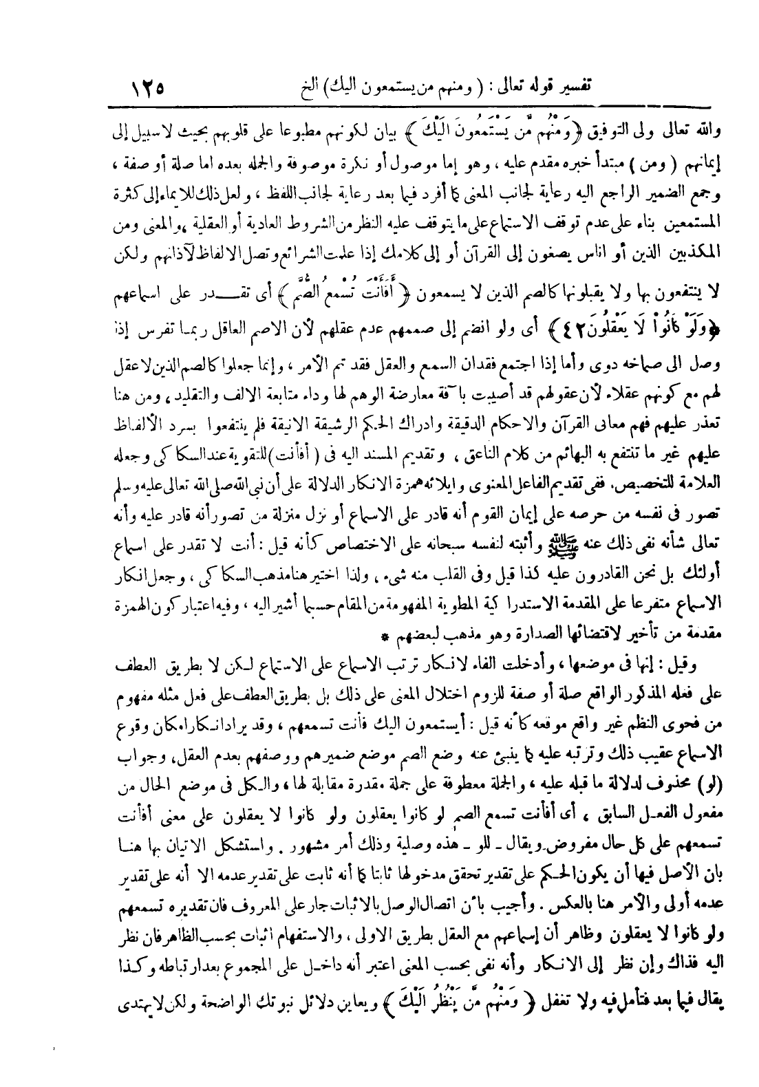 والله تعالى ولي التوفيق ومنهم من يستمعون إليك بيان لكونهممطبوعا على قلوبهم بحيث لا سبيل إلى إيمانهم ومن مبتدأ خبره مقدم عليه وهو إما موصول أو نكرة موصوفة والجمله بعده إما صلة أو صفة وجمع الضمير الراجع إليه رعاية لجانب المعنى كما أفرد فيما بعدرعاية لجانب اللفظ ولعل ذلك للإيماء إلى كثرة المستمعين بناء علىعدم توقف الإستماع على ما يتوقف عليه النظر من الشروط العادية أو العقلية والمعنى ومن المكذبين الذين أو أناس يصغون إلى القرآن أوإلى كلامك إذا علمت الشرائع وتصل الألفاظ لآذانهم ولكن لا ينتفعون بها ولايقبلونها كالصم الذين لايسمعون أفأنت تسمع الصم أي تقدر على إسماعهم ولو كانوا لا يعقلون 42 أي ولو إنضم إلى صممهم عدم عقلهم لأنالأصم العاقل ربما تفرس إذا وصل إلى صماخه دوي وأما إذا إجتمع فقدان السمع والعقل فقد تم الأمر وإنما جعلوا كالصم الذين لا عقل لهم مع كونهم عقلاء لأن عقولهم قد أصيبت بآفة معارضة الوهم لها وداء متابعةالالف والتقليد ومن هنا تعذر عليهم فهم معاني القرآن والأحكام الدقيقة وإدراك الحكم الرشيقة الأنيقة فلم ينتفعوا بسرد الألفاظ عليهم غير ما تنتفع به البهائم من كلام الناعق وتقديم المسند إليه في أفأنت للتقوية عند السكاكي وجعله العلامة للتخصيص ففي تقديم الفاعل المعنوي وإيلائه همزة الإنكار الدلالة على أن نبي الله صلى الله عليه و سلم تصورفي نفسه من حرصه على إيمان القوم أنه قادر على الإسماع أو نزل منزلةمن تصور أنه قادر عليه وأنه تعالى شأنه نفى ذلك عنه صلى الله عليه و سلم وأثبته لنفسه سبحانه على الإختصاص كأنه قيل : أنت لا تقدر على إسماع أولئك بل نحن القادرون عليه كذا قيل وفي القلب منه شيء ولذا أختير هنا مذهب السكاكي وجعل إنكار الإسماع متفرعا على المقدمة الإستدراكية المطويةالمفهومة من المقام حسبما أشير إليه وفيه إعتبار كون الهمزة مقدمة من تأخير لإقتضائها الصدارة وهو مذهب لبعضهم