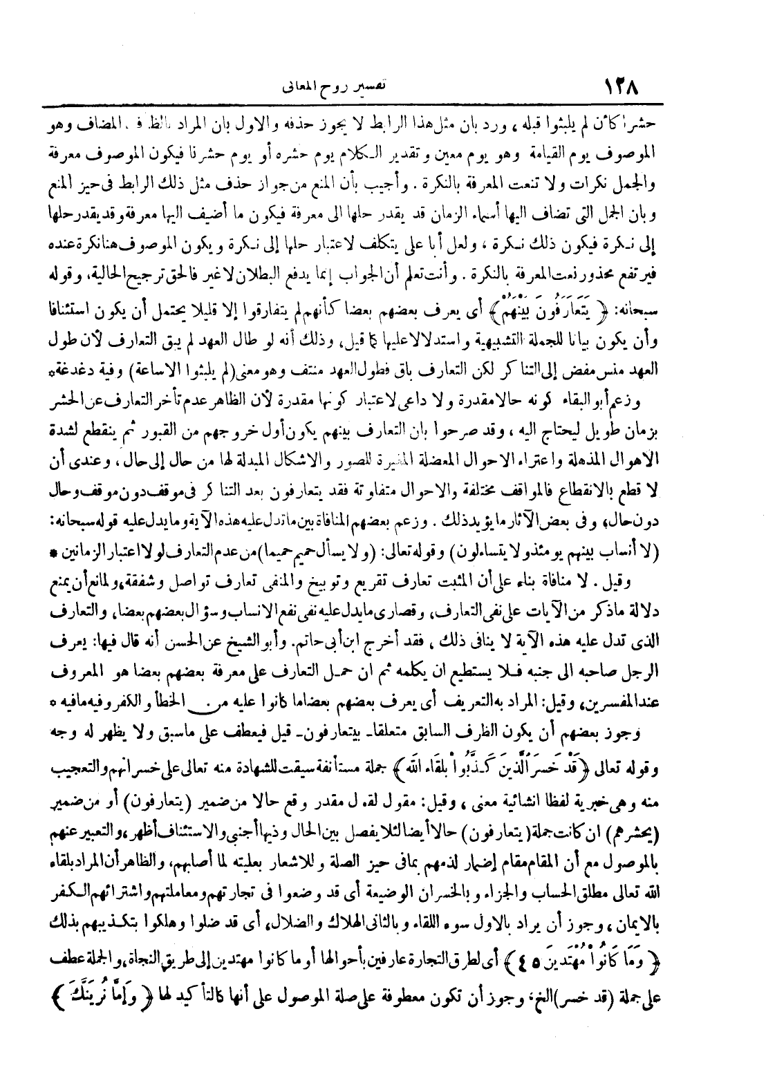 وزعم أبو البقاء كونه حالا مقدرة ولا داعي لإعتبار كونها مقدرةلأن الظاهر عدم تأخر التعارف عن الحشر بزمان طويل ليحتاج إليه وقدصرحوا بأن التعارف بينهم يكون أول خروجهم من القبور ثم ينقطع لشدةالأهوال المذهلة وإعتراء الأحوال المعضلة المغيرة للصور والأشكال المبدلة لها من حال إلى حال وعندي أن لا قطع بالإنقطاع فالمواقف مختلفة والأحوال متفاوتة فقد يتعارفون بعد التناكر في موقف دون موقفوحال دون حال وفي بعض الآثار ما يؤيد ذلك وزعم بعضهم المنافاة بين ما تدل عليه هذه الآية وما يدل عليه قوله سبحانه : لا أنساب بينهم يومئذ ولا يتساءلون وقوله تعالى : ولا يسأل حميم حميما من عدم التعارف لولا إعتبار الزمانين
