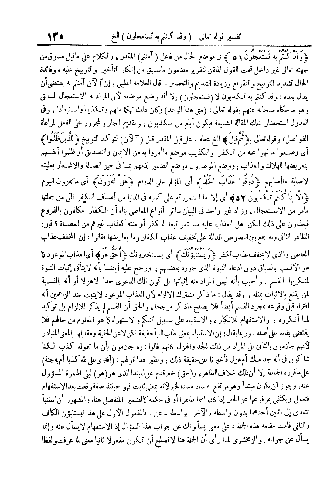 وقد كنتم به تستعجلون 51 في موضع الحال من الفاعل آمنتم المقدر والكلام على ما قيل مسوق من جهته تعالى غير داخل تحت القول الملقن لتقرير مضمون ما سبق من إنكار التأخير والتوبيخ عليه وفائدةالحال تشديد التوبيخ والتقريع وزيادة التنديم والتحسير قال العلامة الطيبي : إن آلآن آمنتم به يقتضي أن يقال بعده : وقد كنتم به تكذبون لا تستعجلون إلا أنه وضع موضعه لأن المراد به الإستعجال السابق وهو ما حكاه سبحانه عنهم بقوله تعالى : متى هذا الوعد وكان ذلك تهكما منهم وتكذيبا وإستعبادا وفي العدول إستحضار لتلك المقالة الشنيعة فيكون أبلغ من تكذبون وتقديم الجار والمجرور على الفعل لمراعاة الفواصل وقوله تعالى : ثم قيل إلخ عطف على قيل المقدر قبل آلآن لتوكيد التوبيخ للذين ظلموا أي وضعوا ما نهوا عنه من الكفر والتكذيب موضع ما أمروا به من الإيمان والتصديق أو ظلموا أنفسهم بتعريضها للهلاك والعذاب ووضع الموصول موضع الضمير لذمهم بما في حيز الصلة والإشعار بعليته لإصابه ما أصابهم ذوقوا عذاب الخلد أيالمؤلم على الدوام هل تجزون أي ما تجزون اليوم إلا بما كنتم تكسبون ... أي إلا ما إستمررتم على كسبه في الدنيا من أصناف الكفر التي من جملتها ما مر من الإستعجال وزاد غير واحد في البيان سائر أنواع المعاصي بناء أن الكفارمكلفون بالفروع فيعذبون على ذلك لكن هل العذاب عليه مستمر تبعا للكفر أو منته كعذاب غيرهم من العصاة قيل : الظاهر الثاني وبأجمع بين النصوص الدالة على تخفيف عذاب الكفار وما يعارضها فقالوا : إن المخفف عذاب المعاصي والذي لا يخفف عذاب الكفر ويستنبؤنك أي يستخبرونك أحق هو أي العذاب الموعود كما هو الأنسب بالسياق دون إدعاء النبوة الذي جوزه بعضهم ورجح عليه أيضا بأنه لا يتأتى إثبات النبوة لمنكريها بالقسم وأجيب بأنه ليس المراد منه إثباتها بل كون تلك الدعوى جدا لا هزلا أو أنه بالنسبة لمن يقنع بالإثبات بمثله وقديقال : ما ذكر مشترك الإلزام لأن العذاب الموعود لا يثبت عند الزاعمين أنه إفتراء قبل وقوعه بمجرد القسم أيضا فلا يصلح ماذكر مرجحا والحقأن القسم لم يذكر للإلزام بل توكيد لما أنكروه والإتفهام للإنكار والإستنباء على سبيل التهكم والإستهزاء كما هو المعلوم من حالهم فلايقتضي بقاءه على أصله وربما يقال : إن الإستنباء بمعنى طلب حقيقة لكن لا عن الحقية ومقابلها بالمعنى المتبادر لأنهم جازمون بالثاني بل المراد من ذلك الجد والهزل كأنهم قالوا : إنا جازمون بأن ما تقوله كذب لكنا شاكون في أنه جد منك أم هزل فأخبرنا عن حقيقة ذلك ونظير هذا قولهم : أفترى على الله كذبا أم به جنة على ماقرره الجماعة إلا أن ذلك خلاف الظاهر و حق خبر قدم على المبتدأ الذي هو هو ليلى الهمزة المسؤول عنه وجوز أن يكون مبتدأ وهو مرتفع به ساد مسد الخبر لأنه بمعنى ثابت فهو حينئذ صفة وقعت بعد الإستفهام فتعمل ويكتفي بمرفوعها عن الخبر إذا كان إسما ظاهرا أو فى حكمه كالضمير المنفصل هنا والمشهور أن إستنبأ تتعدى إلى إثنين أحدهما بدون واسطة والآخر بواسطة عن فالمفعول الأول على هذا ليستنبؤن الكاف والثاني قامت مقامه هذه الجملة على معنى يسألونك عن جواب هذا السؤال إذ الإستفهام لا يسأل عنه وإنما يسأل عن جوابه والزمخشري لما رأى أن الجملة هنا لا تصلح أن تكون مفعولا ثانيا معنى لما عرفت ولفظا