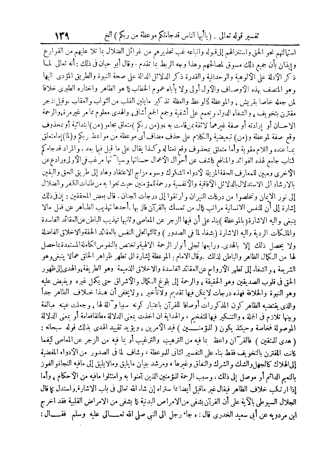 إستمالتهم نحو الحق وإستنزالهم إلى قبوله وإتباعه غب تحذيرهم من غوائل الضلال بما تلا عليهم من القوارع وإيذان بأن جميع ذلك مسوق لمصالحهم وهذا وجه الربط بما تقدم وقال أبو حبان في ذلك : أنه تعالى لما ذكر الأدلة على الألوهية والوحدانية والقدرة ذكر الدلائل الدالة على صحة النبوة والطريق المؤدي إليها وهو المتصف بهذه الأوصافوالأول أولى ولا يأباه عموم الخطاب كما هو الظاهر وإختاره الطبري خلافا لمن جعله خاصا بقريش والموعظة كالوعظ والعظة تذكير ما يلين القلب من الثواب والعقاب وقيل : زجر مقترن بتخويف والشفاء الدواء ويجمع على أشفية وجمع الجمع أشافي والهدى معلوم مما مر غير مرة والرحمة الإحسان أو إرادته أو صفة غيرهما لائقة بمن قامت به و من ربكم متعلق بجاء و من إبتدائية أو بمحذوف وقع صفة لموعظة و من يبعيضية والكلام على حذف مضاف أي موعظة من مواعظ ربكم و لما إما متعلق بما عنده واللام مقوية وأما متعلق بمحذوف وقع نعتا له وكذا يقال على ما قيل فيما بعد والمراد قد جاءكم كتاب جامع لهذه الفوائد والمنافع كاشف عن أحوال الأعمال حسناتها وسيآتها مرغب في الأولى ورادع عن الأخرى ومبين للمعارف الحقة المزيلة لأدواء الشكوك وسوء مزاج الإعتقاد وهاد إلى طريق الحق واليقين بالإرشاد إلى الإستدلال بالدلائل الآفاقية والأنفسية ورحمة للمؤمنين حيث نجوا به من ظلمات الكفر والضلال إلى نور الإيمان وتخلصوا من دركات النيران وإرتقوا إلى درجات الجنان قال بعض المحققين : إن في ذلك إشارة إلى أن للنفس الإنسانية مراتب كمال من تمسك بالقرآن فاز بها أحدها تهذيب الظاهر عن فعل ما لا ينبغي وغليه الإشارة بالموعظة بناء على أن فيها الزجر عن المعاصي وثانيها تهذيب الباطن عن العقائد الفاسدة والملكات الردية وإليهالإشارة بشفاء لما في الصدور وثالثها تحلي النفس بالعقائد الحقة والاخلاق الفاضلة ولا يحصل ذلك إلا بالهدى ورابعها تجلي أنوار الرحم الإلهية وتختص بالنفوس الكاملة المستعدة بما حصل لها من الكمالالظاهر والباطن لذلك وقال الإمام : الموعظة إشارة إلى تطهر ظواهر الخلق عما لا ينبغي وهو الشريعة والشفاء إلى تطهر الأرواح عن العقائد الفاسدة والأخلاق الذميمة وهو الطريقة والهدى إلى ظهور الحق في قلوب الصديقين وهو الحقيقة والرحمة إلى بلوغ الكمال والأشراق حتى يكمل غيره ويفيض عليه وهو النبوة والخلافة فهذه درجات لا يمكن فيها تقديم ولا تأخير ولا يخفى أن هذا خلاف الظاهر جدا والذي يقتضيه الظاهر كون المذكورات أوصافا للقرآن بإعتبار كونه سببا وآلة لها وجعلت عينهمبالغة وبينها تلازم في الجملة والتنكير فيها للتفخيم والهداية أن أخذت بمعنى الدلالة مطلقا فعامة أو بمعنى الدلالة الموصولة فخاصة وحينئذ يكون للمؤمنين قيد الأمرين ويؤيد تقييد الهدى بذلك قوله سبحانه : هدى للمتقين فالقرآن واعظ لما فيه من الترهيب والترغيب أو بما فيه من الزجر عن المعاصي كيفما كانت المقترن بالتخويف فقط بناء على التفسير الثاني للموعظة وشاف لما في الصدور من الأدواء المفضية إلى الهلاك كالجهل والشك والشرك والنفاق وغيرها ومرشد ببيان ما يليق وما لا يلقيق إلى مافيه النجاة والفوز بالنعيم الدائم أو موصل إلى ذلك وسبب الرحمة للمؤمنين الذين آمنوا به وإمتثلوا من الأحكام وأما إذا إرتكب خلاف الظاهر فيقال غير ما قيل أيضا مما ستراه إن شاء الله تعالى في باب الإشارة وإستدل كما قال الجلال السيوطي بالآية على أن القرآن يشفي من الأمراض البدنية كما يشفي من الأمراض القلبية فقد أخرج ابن مردويه عن أبي سعيد الخدري قال : جاء رجل إلى النبي صلى اللهألأآ عليه وسلم فقال :