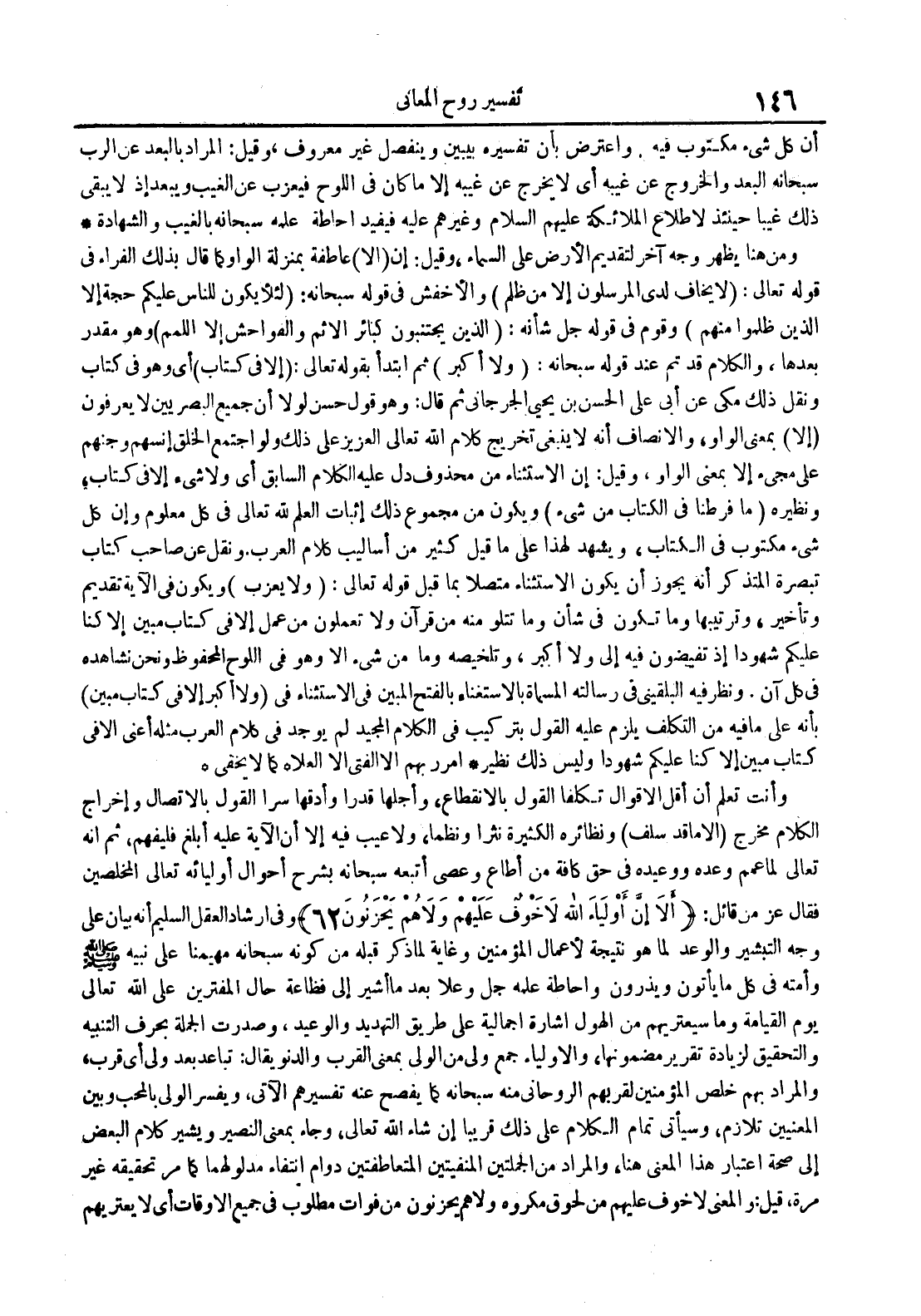 وأنت تعلم أن أقل الأقوال تكلفا القول بالإنقطاع وأجلها قدراوأدقها سرا القول بالإتصال وإخراج الكلام مخرج إلا ما قد سلف ونظائره الكثيرة نثرا ونظما ولا عيب فيه إلا أن الآية عليه أبلغ فليفهم ثم إنه تعالى لما عمم وعده ووعيده في حق كافة من أطاع وعصى أتبعه سبحانه بشرح أحوال أوليائه تعالى المخلصين فقال عز من قائل : ألا إن أولياء الله لا خوف عليهم ولا هم يحزنون 62 وفي إرشاد العقل السليم أنه بيان على وجه التبشير والوعد لما هو نتيجة لأعمال المؤمنين وغاية لما ذكر قبله من كونه سبحانه مهيمنا على نبيه صلى الله عليه و سلم وأمته في كلما يأتون ويذرون وأحاطه علمه جل وعلا بعد ما أشير إلى فظاعة حال المفترين على الله تعالى يوم القيامة وما سيعتريهم من الهول إشارةإجمالية على طريق التهديد والوعيد وصدرت الجملة بحرف التنبيه والتحقيق لزيادة تقرير مضمونها والأولياء جمع ولي من الولي بمعنى القرب والدنو يقال : تباعد بعد ولي أي قرب والمراد بهم خلص المؤمنين لقربهم الروحاني منه سبحانه كما يفصح عنه تفسيرهعم الآتي ويفسر الولي بالمحب وبين المعنيين تلازم وسيأتي تمام الكلام على ذلك قريبا إن شاء الله تعالى وجاء بمعنى النصير ويشير كلام البعض إلى صحة إعتبار هذا المعنى هنا والمراد من الجملتين المنفيتين المتعاطفتين دوام إنتفاء مدلولهما كما مر تحقيقه غير مرة قيل : والمعنى لا خوف عليهم من لحوق مكروه ولا هم يحزنون من فوات مطلوب في جميع الأوقات أي لا يعتريهم