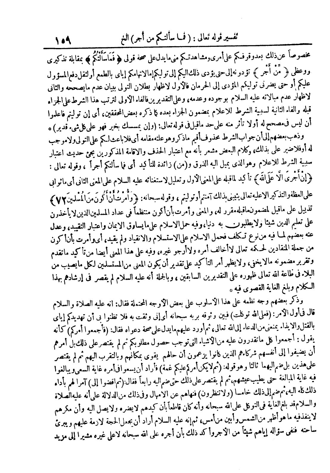 وذهب بعضهم إلى أن جواب الشرط محذوف أقيم ما ذكر وهو علته مقامه أي فلا باعث لكم على التولي ولا موجب له أو فلا ضير علي بذلك وكلام البعض مشعر بأنه مع إعتبار الحذف والإقامة المذكورين يجيء حديث إعتبارسببية الشرط للإعلام وهو الذي يميل إليه الذوق و من زائدة للتأكيد أي فما سألتكم أجرا وقوله تعالى : إن أجري إلا على الله تأكيد لما قبله على المعنى الأول وتعليل لإستغنائه عليه السلام على المعنى الثانيأي ماثوابي على العظة والتذكير إلا عليه تعالى يثيبني بذلك آمنتم أو توليتم وقوله سبحانه : وأمرت أن أكون من الملسمين 72 تذييل علىما قيل لمضمون ما قبله مقرر له والمعنى وأمرت بأن أكون منتظما في عداد الملسمين الذين لا يأخذون على تعليم الدين شيئا ولا يطلبون بهدينا وفيه حمل الإسلام على ما يساوق الإيمان وإعتبار التقييد وعدلعنه بعضصهم لما فيه من نوع تكلف فحمل الإسلام على الإستسلام والإنقيادولم يقيد أي وأمرت بأن أكون من جملة المنقادين لحكمه تعالى لاأخالف أمره ولا أرجوا غيره وفيه على هذا المعنى أيضا من تأكيدما تقدم وتقرير مضمونه ما لا يخفى ولا يظهر أمر التأكيد على تقدير أن يكون المعنى من المستسلمين لكل ما يصيب من البلاء في طاعة الله تعالى ظهوره على التقديرين السابقين وبالجملة أنه عليه السلام لم يقصر في إرشادهم بهذا الكلام وبلغ الغاية القصوى فيه