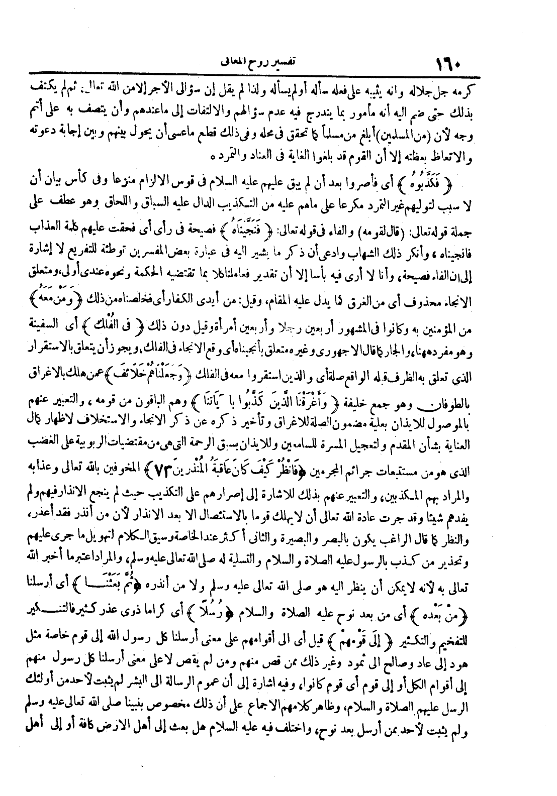 فكذبوه أي فأصروا بعد أن لم يبق عليهم عليه السلام في قوس الإلزاممنزعا وفي كأس بيان أن لا سبب لتوليهم غير التمرد مكرعا على ما هم عليه من التكذيب الدال عليه السباق واللحاق وهو عطف على جملة قوله تعالى : قال لقومه والفاء في قوله تعالى : فنجيناه فصيحة في رأى أي فحقت عليهم كلمة العذاب فأنجيناه وأنكر ذلك الشهاب وإدعى أن ذكر ما يشير إليه في عبارة بعض المفسرين توطئة للتفريع لا إشارة إلى أن الفاء فصيحة وأنا لا أرى فيه بأسا إلا أن تقدير فعاملنا كلا بما تقتضيه الحكمة ونحوه عندي أولى ومتعلق الإنجاء محذوف أي من الغرقكما يدل عليه المقام وقيل : من أيدي الكفار فخلصناه من ذلك ومنمعه من المؤمنين به وكانوا في المشهور أربعين رجلا وأربعين إمرأةوقيل دون ذلك في الفلك أي السفينة وهو مفرد ههنا والجار كما قال الأجهوري وغيره متعلق بأنجيناه أي وقع الإنجاء في الفلك ويجوز أن يتعلق بالإستقرار الذي تعلق به الظرف قبله الواقع صلة أي والذين إستقروا معه في الفلك وجعلناهم خلائف عمن هلك بالإغراق بالطوفان وهو جمع خليفة وأغرقنا الذيبن كذبوا بآياتنا وهم الباقون منقومه والتعبير عنهم بالموصول للإيذان بعلية مضمون الصلة للإغراق وتأخير ذكره عن ذكر الإنجاء والإستخلاف لإظهار كمال العناية بشأن المقدم ولتعجيل المسرة للسامعين وللإيذان بسبق الرحمة التي هي من مقتضيات الربوبية على الغضب الذي هو من مستتبعات جرائم المجرمين فانظر كيف كان عاقبة المنذرين 73 المخوفين بالله تعالى وعذابه والمراد بهمالمكذبين والتعبير عنهم بذلك للإشارة إلى إصرارهم على التكذيب حيثلم ينجع الإنذار فيهم ولم يفدهم شيئا وقد جرت عادة الله تعالى أن لا يهلك قوما بالإستئصال إلا بعد الإنذار لأن من أنذر فقد أعذر والنظركما قال الراغب يكون بالبصر والبصيرة والثاني أكثر عند الخاصة وسيقالكلام لتهويل ما جرى عليهم وتحذير من كذب بالرسول عليه الصلاة و السلام والتسلية له صلى الله تعالى عليه وسلم والمراد إعتبر ما أخبر الله تعالى به لأنه لا يمكن أن ينظر إليه هو صلى الله عليه و سلم ولامن أنذره ثم بعثنا أي أرسلنا من بعده أي من بعد نوح عليه الصلاة و السلام رسلا أي كراما ذوى عذر كثيرفالتنكير للتفخيم والتكثير إلى قومهم قيل أي إلى أقوامهم على معنى أرسلنا كل رسول الله إلى قوم خاصة مثل هود إلى عاد وصالح إلى ثمود وغير ذلك ممن قص منهم ومن لم يقص لا على معنى أرسلنا كل رسولمنهم إلى أقوام الكل أو إلى قوم أي قوم كانوا وفيه إشارة إلى أن عموم الرسالة إلى البشر لم يثبت لأحد من أولئك الرسل عليهم الصلاة والسلام وظاهر كلامهم الإجماع على أن ذلك مخصوص بنبينا صلى الله عليه و سلم ولم يثبت لأحد ممن أرسل بعد نوح وإختلف فيه عليه السلام هل بعث إلى أهل الأرض كافة أو إلى أهل