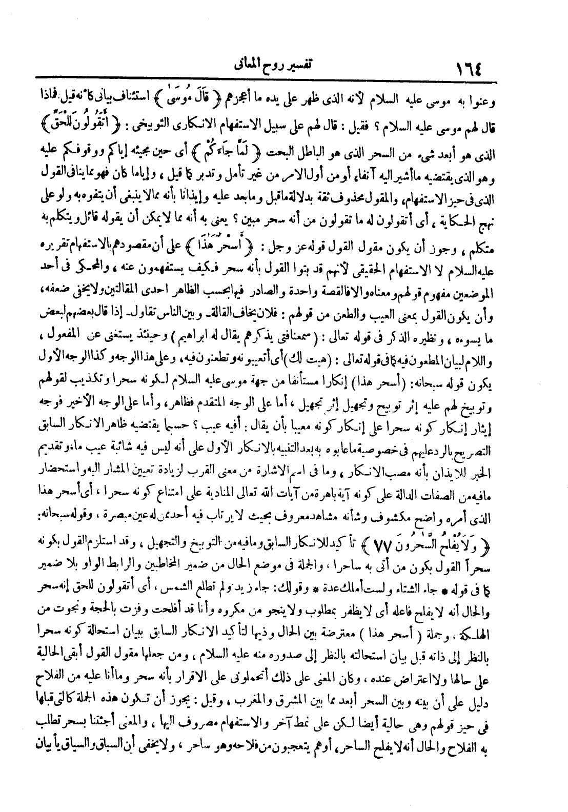 وقولك : جاء زيد ولم تطلع الشمس أي أتقولون للحق إنهسحر والحال أنه لا يفلح فاعله أي لا يظفر بمطلوب ولا ينحو من مكروه وأنا قد أفلحت وفزت بالحجة ونجوت من الهلكة وجملة أسحر هذا معترضة بين الحال وذيها لتأكيد الإنكار السابق ببيان إستحالة كونه سحرا بالنظر إلى ذاته قبل بيان إستحالته بالنظر إلى صدوره منه عليه السلام ومن جعلها مقول القول أبقى الحالية على حالها ولا إعتراض عنده وكان المعنى على ذلك أتحملوني على الإقرار بأنه سحر وما أنا عليه من الفلاح دليل على أن بينه وبين السحر أبعد مما بين المشرق والمغرب : يجوز أن تكون هذه الجملة كالتي قبلها في حيز قولهم وهي حالية أيضا لكن على نمط آخر والإستفهام مصروف إليها والمعنى أجئتنا بسحر تطلب به الفلاح والحال أنه لا يفلح الساحر أوهم يتعجبون من فلاحه وهو ساحر ولا يخفى أن السباق والسياق يأبيان