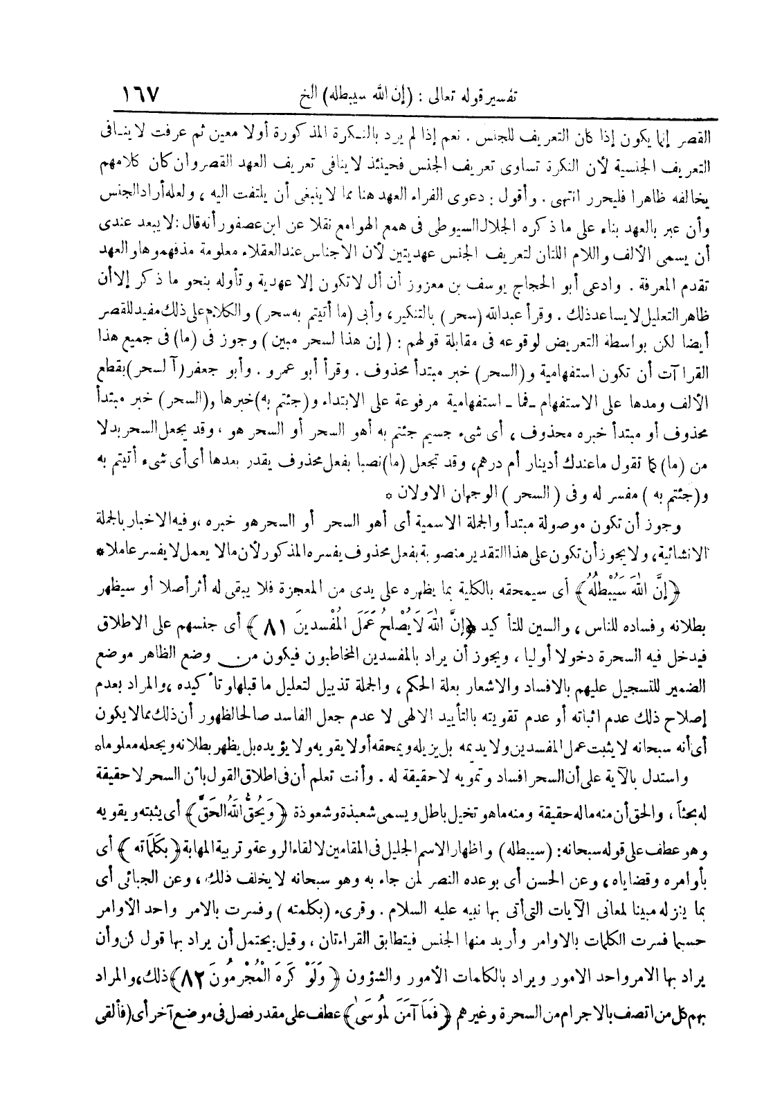 القصر إنما يكون إذا كان التعريف للجنس نعم إذا لم يرد بالنكرة المذكورة أو لا معين ثم عرفت لا ينافي التعريف الجنسية لأن النكرة تساوي تعريف الجنس فينئذ لا ينافي تعريف العهد القصر وإن كان كلامهم يخالفهظاهرا فليحرر إنتهى وأقول : دعوى الفراء العهد هنا مما لا ينبغي أن يلتفت إليه ولعله أراد الجنس وأن عبر بالعهد بناء على ما ذكرهالجلال السيوطي في همع الهوامع نقلا عن ابن عصفور أنه قال : لا يبعدعندي أن يسمى الألف واللام اللتان لتعريف الجنس عهديتين لأن الإجناس عند العقلاء معلومة مذ فهموها والعهد تقدم المعرفة وإدعى أبو الحجاجيوسف بن معزوز أن أل لا تكون إلا عهدية وتأوله بنحو ما ذكر إلا أن ظاهرالتعليل لا يساعد ذلك وقرأ عبدالله سحر بالتنكير وأبي ما أتيتمبه سحر والكلام على ذلك مفيد للقصر أيضا لكن بواسطةالتعريض لوقوعهفي مقابلة قولهم : إن هذا لسحر مبين وجوز في ما في جميع هذاالقراآت أن تكون إستفهامية و السحر خبر مبتدأ محذوف وقرأ أبوعمرو وأبو جعفر آلسحر بقطع الألف ومدها على الإستفهام فما إستفهامية مرفوعة على الإبتداء و جئتم به خبرها و السحر خبر مبتدأمحذوف أو مبتدأ خبره محذوف أي شيء جسيم جئتم به أهو السحر أو السحر هو وقد يجعل السحر بدلا من ما كما تقول ما عندك أدينار أمدرهم وقد تجعل ما نصبا بفعل محذوف يقدر بعدها أي أي شيء أتيتم به و جئتم به مفسر له وفي السحر الوجهان الأولان