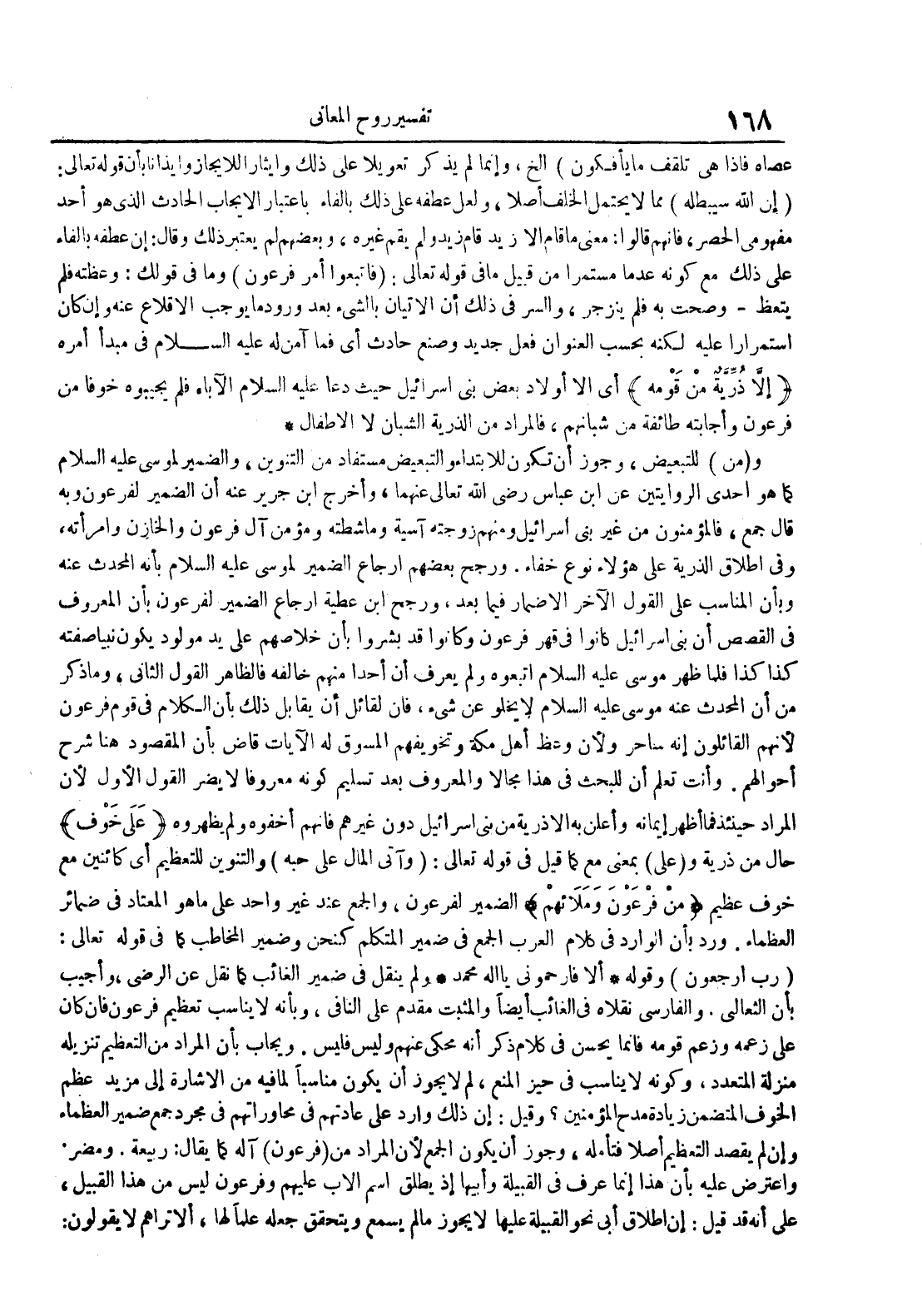 عصاه فإذا هي تلقف ما يأفكون إلخ وإنما لم يذكر تعويلا على ذلك وإيثار اللإيجاز وإيذانا بأن قوله تعالى : إن الله سيبطله ممالايحتمل الخلف أصلا ولعل عطفه على ذلك بالفاء بإعتبار الإيجاب الحادث الذي هو أحد مفهومي الحصر فإنهم قالوا : معنى ماقام إلا زيد قام زيد ولم يقم غيره وبعضهم لم يعتبر ذلك وقال : إن عطفه بالفاء على ذلك مع كونه عدما مستمرا من قبيل ما في قوله تعالى : فاتبعوا أمر فرعون وما في قولك : وعظته فلم يتعظ وصحت به فلم ينزجر والسر فيذلك أن الإتيان بالشيء بعد ورود ما يوجب الإقلاع عنه وإن كان إستمراراعليه لكنه بحسب العنوان فعل جديد وصنع حادث أي فما آمن له عليهالسلام في مبدأ أمره إلا ذرية من قومه أي إلا اولاد بعض بنيإسرائيل حيث دعا عليه السلام الآباء فلم يجيبوه خوفا من فرعون وأجابته طائفة من شبانهم فالمراد من الذرية الشبان لاالأطفال