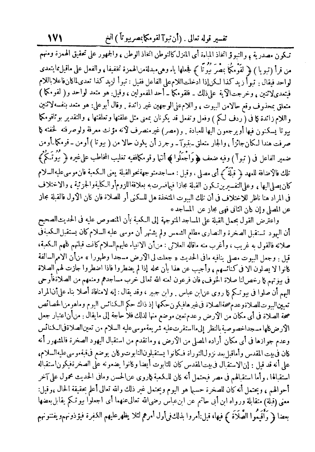 تكون مصدرية والتبوؤ إتخاذ المباءة أي المنزل كالتوطن إتخاذ الوطن والجمهور على تحقيق الهمزة ومنهم من قرأ تبويا لقومكما بمصربيوتا فجعلها ياء وهي مبدلة من الهمزة تخفيفا والفعل على ما قيلمما يتعدى لواحد فيقال : تبوأ زيد كذا لكن إذا أدخلت اللام علىالفاعل فقيل : تبوأ لزيد كذا تعدى لما كان فاعلا باللام فيتعدى لإثنين وخرجت الآية على ذلك فلقومكما أحد المفعولين وقيل : هو متعد لواحد و لقومكما متعلق بمحذوف وقع حالا من البيوت واللام على الوجهين غير زائدة وقال أبو علي : هو متعد بنفسه لإثنين واللام زائدة كما في ردف لكم وفعل وتفعل قد يكونان بمعنى مثل علقتهاوتعلقها والتقدير بوئا قومكما بيوتا يسكنون فيها أو يرجعون إليها للعبادة و مصر غير منصرف لأنه مونث معرفة ولو صرفته لخفته كما صرفت هندا لكان جائزا والجار متعلق بتبوآ وجوز أن يكون حالا من بيوتا أومن قومكما أومن ضمير الفاعل في تبوآ وفيه ضعف واجعلوا أنتما وقومكما ففيه تغليب المخاطب على غيره بيوتكم تلك فالأضافة للعهد قبلة أي مصلى وقيل : مساجد متوجهة نحوالقبلة يعني الكعبة فإن موسى عليه السلام كان يصلي إليها وعلى التفسرين تكون القبلة مجازا فيما فسرت به بعلاقة اللزوم أو الكلية والجزئية والإختلاف في المراد هنا ناظر للإختلاف في أن تلك البيوتالمتخذة هل للسكنى أو للصلاة فإن كان الأول فالقبلة مجاز عن المصلى وإن كان الثاني فهي مجاز عن المساجد