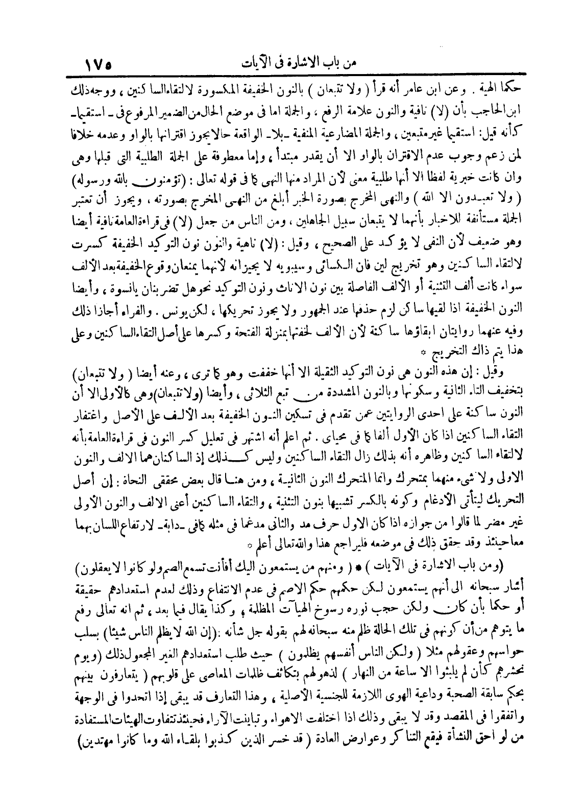 حكما إلهية وعن ابن عامر أنه قرأ ولا تتبعان بالنون الخفيفة المكسورة لإلتقاء الساكنين ووجه ذلك ابن الحاجب بأن لا نافيةوالنون علامة الرفع والجملة إما في موضع الحال من الضمير المرفوع في استقيما كأنه قيل : إستقيما غير متبعين والجملة المضارعيةالمنفية بلا الواقعة حالا يجوز إقترانها بالواو وعدمه خلافا لمنزعم وجوب عدم الإقتران بالواو إلا أن يقدر مبتدأ وإما معطوفة على الجملة الطلبية التي قبلها وهي وإن كانت خبرية لفظا إلا أنها طلبيةمعنى لأن المراد منها النهي كما في قوله تعالى : تؤمنون بالله ورسوله ولا تعبدون إلا الله والنهي المخرج بصورة الخبر أبلغ من النهي المخرج بصورته ويجوز أن تعتبر الجملة مستأنفة للإخبار بأنهما لا يتبعان سبيل الجاهلين ومن الناس من جعل لا في قراءة العامة نافية أيضا وهو ضعيف لأن النفي لا يؤكد على الصحيح وقيل : لا ناهية والنون نون التوكيد الخفيفة كسرت لإلتقاء الساكنين وهو تخريج لين فإن الكسائي وسيبويه لا بحيزانه لأنهما يمنعان وقوع الخفيفة بعد الألف سواء كانت ألف التثنية أو الألف الفاصلة بين نون الإناث ونون التوكيد نحوهل تضربنان يا نسوة وأيضا النون الخفيفة إذا لقيها ساكن لزم حذفها عند الجمهور ولا يجوز تحريكها ولكن يونس والفراء أجازا ذلك وفيه عنهما روايتان إبقاؤها ساكنة لأن الألف لخفتها بمنزلة الفتحة وكسرها على أصل التقاء الساكنين وعلى هذا يتم ذاك التخريج