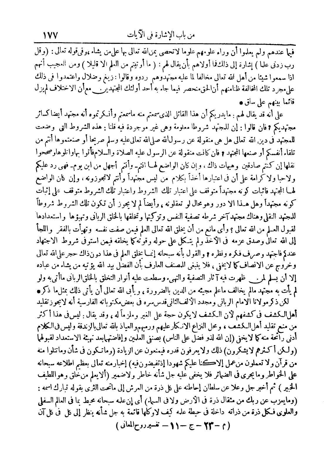 لكن ذكر مولانا اللإمام الرباني ومجدد الألف الثاني قدس سره في بعض مكتوباته الفارسية أنه لا يجوز تقليد أهل الكشف في كشفهم لأن الكشف لا يكون حجة على الغير وملزما له وقد يقال : ليس في هذا أكثر من منع تقليد أهل الكشف و محل النزاع الإنكار عليهم و رميهم العياذ بالله تعالى بالزندقة وليس في الكلام أدنىرائحة منه كما لا يخفى إن الله لذو فضل على الناس بصنفي العلمين وإفاضتهما بعد تهيئة الإستعداد لقبولهما ولكن أكثرهم لا يشكرون ذلك ولا يعرفون قدره فيمنعون عن الزيادة وما تكون في شأن وما تتلوا منه من قرآن ولا تعملون من عمل إلا كنا عليكم شهودا إذ تفيضون فيه إخبار منه تعالى بعظيم اطلاعه سبحانه على الخواطر وما يجري في الضمائر فلا يخفى عليه جل شأنه خاطر ولا ضمير 0 ألا يعلم من خلق وهو اللطيف الخبير ثمأخبر جل وعلا عن سلطان إحاطته على كل ذرة من العرش إلى ما تحت الثرى بقوله تبارك إسمه : وما يعزب عن ربك من مثقال ذرة في الأرض ولا في السماء أي إن علمه سبحانه محيط بما في العالم السقلي والعلوي فكل ذرة من ذارته داخلة في حيطة علمه كيف لا وكلها قائمة به جل شأنه ينظر إلى كل في كل آن