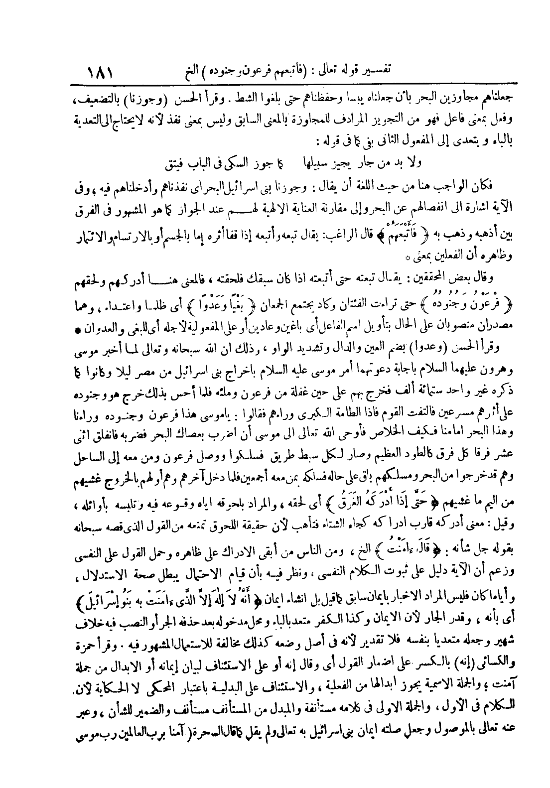 وقال بعض المحققين : يقال تبعته حتى أتبعته إذا كان سبقك فلحقته فالمعنى هنا أدركهم ولحقهم فرعون وجنوده حتى تراءت الفئتان وكاد يجتمع الجمعان بغيا وعدوا أي ظلما وإعتداء وهما مصدران منصوبان علىالحال بتأويل إسم الفاعل أي باغين وعادين أو على المفعولية لأجله أي للبغي والعدوان