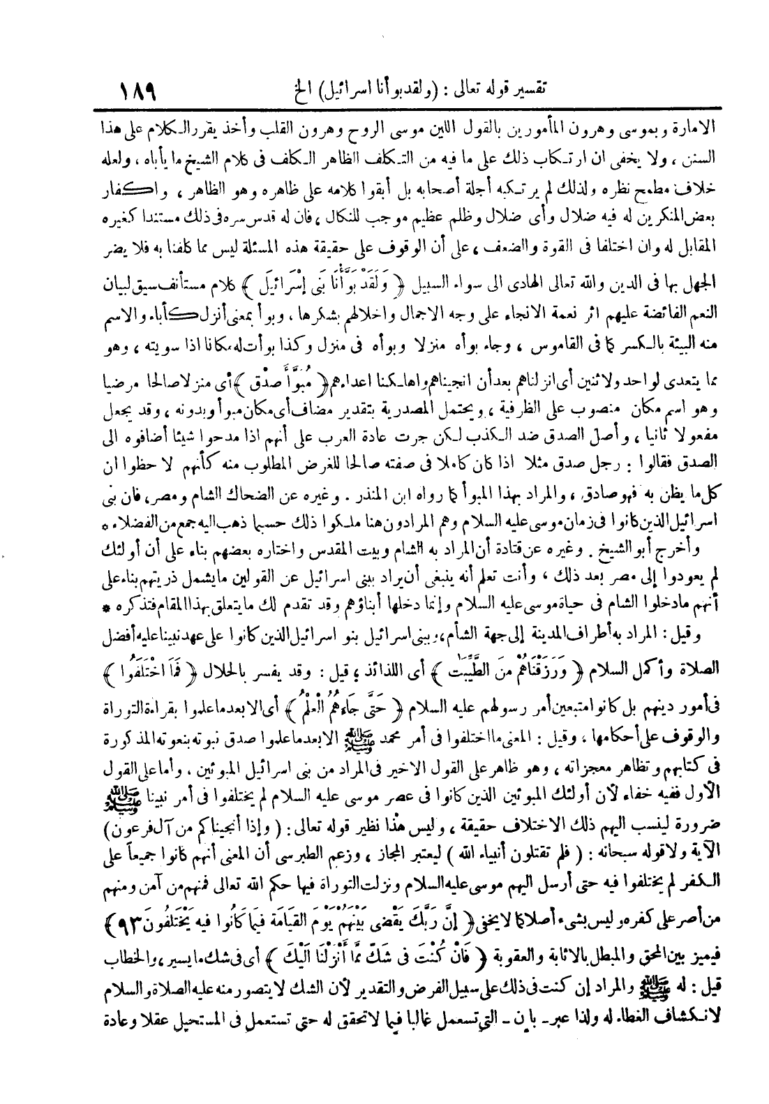 الإمارة وبموسى وهرون المأمورين بالقول اللين موسى الروح وهرون القلب وأخذ يقرر الكلام على هذا السنن ولا يخفى أن إرتكاب ذلك على ما فيه من التكلف الظاهر الكلف في كلام الشيخ مايأباه ولعله خلاف مطمح نظرهولذلك لم يرتكبه أجلة أصحابه بل أبقوا كلامه على ظاهره وهو الظاهر وإكفار بعض المنكرين له فيه ضلال وأي ضلال وظلم عظيم موجب للنكالفإن له قدس سره في ذلك مستندا كغيره المقابل له وإن إختلفا في القوة والضعف على أن الوقوف على حقيقة هذه المسئلة ليس مما كلفنا به فلا يضر الجهل بها في الدين والله تعالى الهادي إلى سواء السبيل ولقد بوأنا بني إسرائيل كلام مستأنف سيق لبيان النعم الفائضة عليهم أثرنعمة الإنجاء على وجه الإجمال وإخلالهم بشكرها وبوأ بمعنى أنزل كأباء والإسم منه البيئة بالكسر كما في القاموس وجاء بوأه منزلا وبوأه فيمنزل وكذا بوأت له مكانا إذا سويته وهو مما يتعدى لواحد ولإثنين أي إنرلناهم بعد أن أنجيناهم وأهلكنا أعداءهم مبوأ صدق أي منزلاصالحا مرضيا وهو إسم مكان منصوب على الظرفية ويحتمل المصدرية بتقدير مضاف أي مكان مبوأ وبدونه وقد يجعل مفعولا ثانيا وأصل الصدق ضد الكدب لكن جرت عادة العرب على أنهم إذا مدحوا شيئا أضافوه إلى الصدق فقالوا : رجل صدق مثلا إذا كان كاملا في صفته صالحا للغرض المطلوب منه كأنهم لاحظوا إن كل ما يطن به فهو صادق والمراد بهذا المبوأ كما رواه ابن المنذر وغيره الضحاك الشام ومصر فإن بني إسرائيل الذين كانوا في زمان موسى عليه السلام وهم المراد هنا ملكواذلك حسبما ذهب إليه جمع من الفضلاء