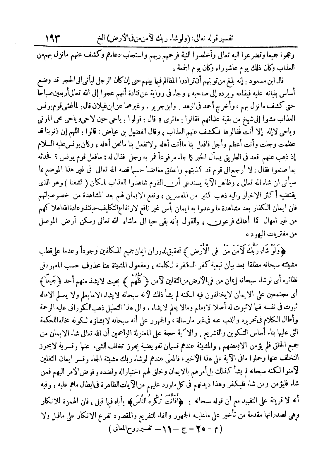 ولو شاء ربك لآمن من في الأرض تحقيق لدوران إيمان جميع المكلفين وجودا وعدما على قطب مشيئته سبحانه مطلقا بعد بيان تبعية كفر الكفرة لكلمته ومفعول المشيئة هنا محذوف حسب المعهود في نظائره أي لو شاء سبحانه إيمان من في الأرض من الثقلين لآمن كلهم بحيث لا يشذ منهم أحد جميعا أي مجتمعين على الإيمان لا يختلفون فيه لكنه لم يشأ ذلك لأنه سبحانه لا يشاء إلا ما يعلم ولا يعلم إلا ما له ثبوت في نفسه فيمالا ثبوت له أصلا لا يعلم ومالايعلم لا يشاء وإلى هذا التعليل ذهب الكورانيعليه الرحمة وأصال الكلام في تحريره والذب عنه في غير ما رسالة والجمهور على أنه سبحانه لا يشاؤه لكونه مخالفا للحكمة التي عليها بناء أساس التكوين والتشريع والآية حجة على المعتزلة الزاعمين أن الله تعالى شاء الإيمان من جميع الخلف فلم يؤمن إلا بعضهم والمشيئة عندهم قسمان تفويضية يحوز تخلف الشيء عنها وقسرية لا يجوز التخلف عنها وحملوا ما في الآية على هذا الأخير فالمعنى عندهم لو شاء ربك مشيئةإلجاء وقسر إيمان الثقلين لآمنوا لكنه سبحانه لم يشأ كذلك بل أمرهم بالإيمان وخلق لهم إختيارا له ولضده وفوض الأمر إليهم فمن شاء فليؤمن ومن شاء فليكفر وهذا ديدنهم في كل ما ورد عليهم من الآيات الظاهرة في إبطال ما هم عليه وفيه أنه لا قرينة على التقييد مع أن قوله سبحانه : أفأنت تكره الناس يأباه فيما قيل فإن الهمزة للإنكار وهي لصدارتها مقدمة من تأخير على ما عليه الجمهور والفاء للتفريع والمقصود فرع الإنكار على ما قبل