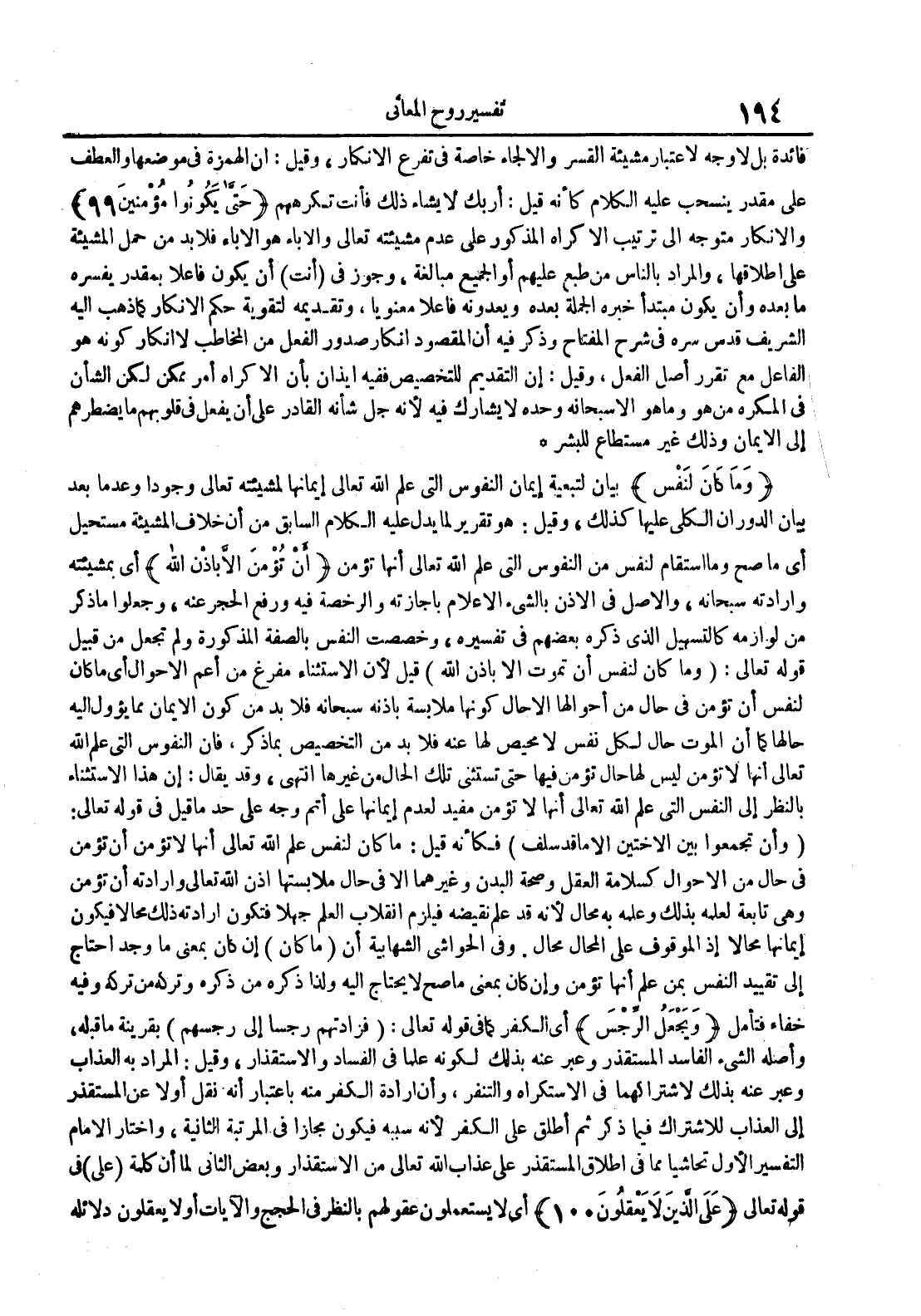 وما كان لنفس بيان لتبعية إيمان النفوس التي علم الله تعالى إيمانها لمشيئته تعالى وجودا وعدما بعد بيان الدوران الكلي عليها كذلك وقيل : هو تقرير لما يدل عليه الكلام السابق من أن خلاف المشيئة مستحيل أي ما صح وما إستقام لنفس من النفوس التي علم اللهتعالى أنها تؤمن أن تؤمن إلا بإذن الله أي بمشيئته وإرادته سبحانه والأصل في الإذن بالشيء الإعلام بإجازته والرخصة فيه ورفع الحجز عنه وجعلوا ما ذكر من لوازمه كالتسهيل الذي ذكره بعضهم في تفسيره وخصصت النفس بالصفة المذكورة ولم تجعل من قبيل قوله تعالى : وما كان لنفس أن تموت إلا بإذن الله قيل لأن الإستثناء مفرغ من أعم الأحوال أي ما كان لنفس أن تومن في حال من أحوالها إلا حال كونها ملابسة بإذنه سبحانه فلا بد من كون الإيمان مما يؤول إليه حالها كما أن الموت حال لكل نفس لا محيص لها عنه فلا بد من التخصيص بما ذكر فإن النفوس التي علم الله تعالى أنها لا تؤمن ليس لها حال تؤمن فيها حتى تستثني تلك الحال من غيرها إنتهىوقد يقال أن هذا الإستثناء بالنظر إلى النفس التي علم الله تعالى أنها لا تؤمن مفيد لعدم إيمانها على أتم وجهعلى حد ما قيل في قوله تعالى : وأن تجمعوا بين الأختين إلا ماقد سلف فكأنه قيل : ما كان لنفس علم الله تعالى أنها لا تؤمن أن تؤمن في حال من الأحوال كسلامة العقل وصحة البدن وغيرهما إلا في حال ملابستها إذن الله تعالى وإرادته أن تؤمن وهي تابعة لعلمه بذلك وعلمه به محال لأنهقد علم نقيضه فيلزم إنقلاب العلم جهلا فتكون إرادته ذلك محالا فيكون إيمانها محالا إذ الموقوف على المحال محال وفي الحواشي الشهابية أن ما كان إن كان بمعنى ما وجد إحتاج إلى تقييد النفس بمن علم أنها تؤمن وإن كان بمعنى ما صح لا يحتاج إليه ولذا ذكره من ذكره وتركه من تركه وفيه خفاء فتأمل ويجعل الرجس أي الكفر كما في قوله تعالى : فزادتهم رجسا إلى رجسهم بقرينة ما قبله وأصله الشيء الفاسد المستقذر وعبر عنه بذلك لكونه علما في الفساد والإيتقذار وقيل : المراد به العذاب وعبر عنه بذلك لإشتراكهما في الإستكراه والتنفر وأن إرادة الكفر منه بإعتبار أنه نقل أولا عن المستقذر إلىالعذاب للإشتراك فيما ذكر ثم أطلق الكفر لأنه سبببه فيكون مجازا فيالمرتبة الثانية وإختار الإمام التفسير الأول تحاشيا مما في إطلاق المستقذر على عذاب الله تعالى من الإستقذار وبعض الثاني لما أن كلمة على في قوله تعالى على الذين لا يعقلون 100 أي لا يستعملون عقولهم بالنظر في الحجج والآيات أولا يعقلون دلائله