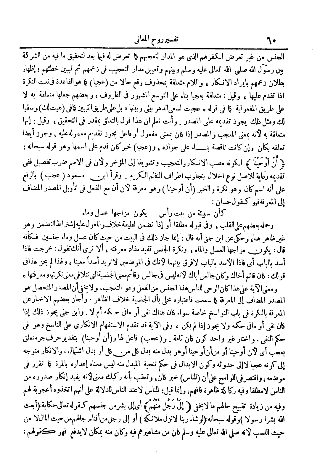 ومعى الآية على هذا كان الوحي للناس هذا الجنس من الفعل وهو التعجب ولايخفى أن المصدر المتحصل هو المصدر المضاف إلى المعرفة كما سمعت فإعتباره محلى بأل الجنسية خلاف الظاهر وأجاز بعضهم الأخبار عن المعرفة بالنكرة في باب النواسخ خاصة سواء كان هناك نفي أو مافي حكمه أم لا وابن جني يجوز ذلك إذا كان نفي أو مافي حكمه ولا يجوز إذا لم يكن وفي الآية قد تقدم الإستفهام الإنكاري على الناسخ وهو في حكم النفي وإختار غير واحد كون كان تامة و عجب فاعل لها و أن أوحينا بتقدير حرف جر متعلق بعجب أي لأن أوحينا أو من أوحينا أن أوحينا أو هو بدل منه كا من كل أو بدل إشتمال والإنكار متوجه موضعه وإقتصر في اللوامح على أن للناس خبر كان وتعقب بأنه ركيك معنى لأنه يفيد إنكار صدوره من الناس مطلقا وفيه ركاكة ظاهرة فإفهم وإنما قيل : للناس لا عند الناس للدلالة على أنهم إتخذوه أعجوبة لهم وفيه من زيادة تقبيح حالهم مالايخفى إلى رجل منهم أي إلى بشر من جنسهم كقوله تعالى حكاية : أبعث الله بشرا رسولا وقوله سبحانه : لوشاء ربنا لأنرل ملائكة أو إلى رجل من أفناء رجالهم من حيث المال لا من حيث النسب لأنه صلى الله عليه و سلم كان من مشاهيرهم فيه وكان منه بمكان لا يدفع فهو كقولهم : مبحث في تفسير قول تعالى : أكان للناس عجبا أن أوحينا الى رجل منهم