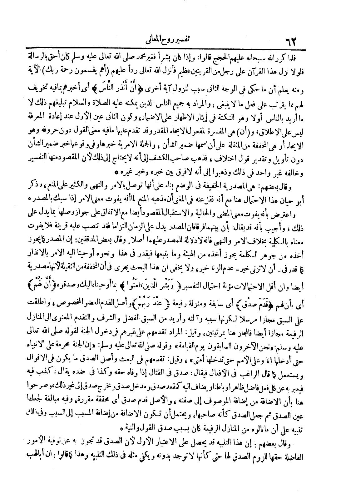 وقال بعضهم : إن هذا التنبيه قد يحصل على الإعتبار الأول لأن الصدق قد تجوز به عن توفية الأمور الفاضلة حقها للزوم الصدق لها حتى كأنها لاتوجد بدونه ويكفي مثله في ذلك التنبيه وهذا كما