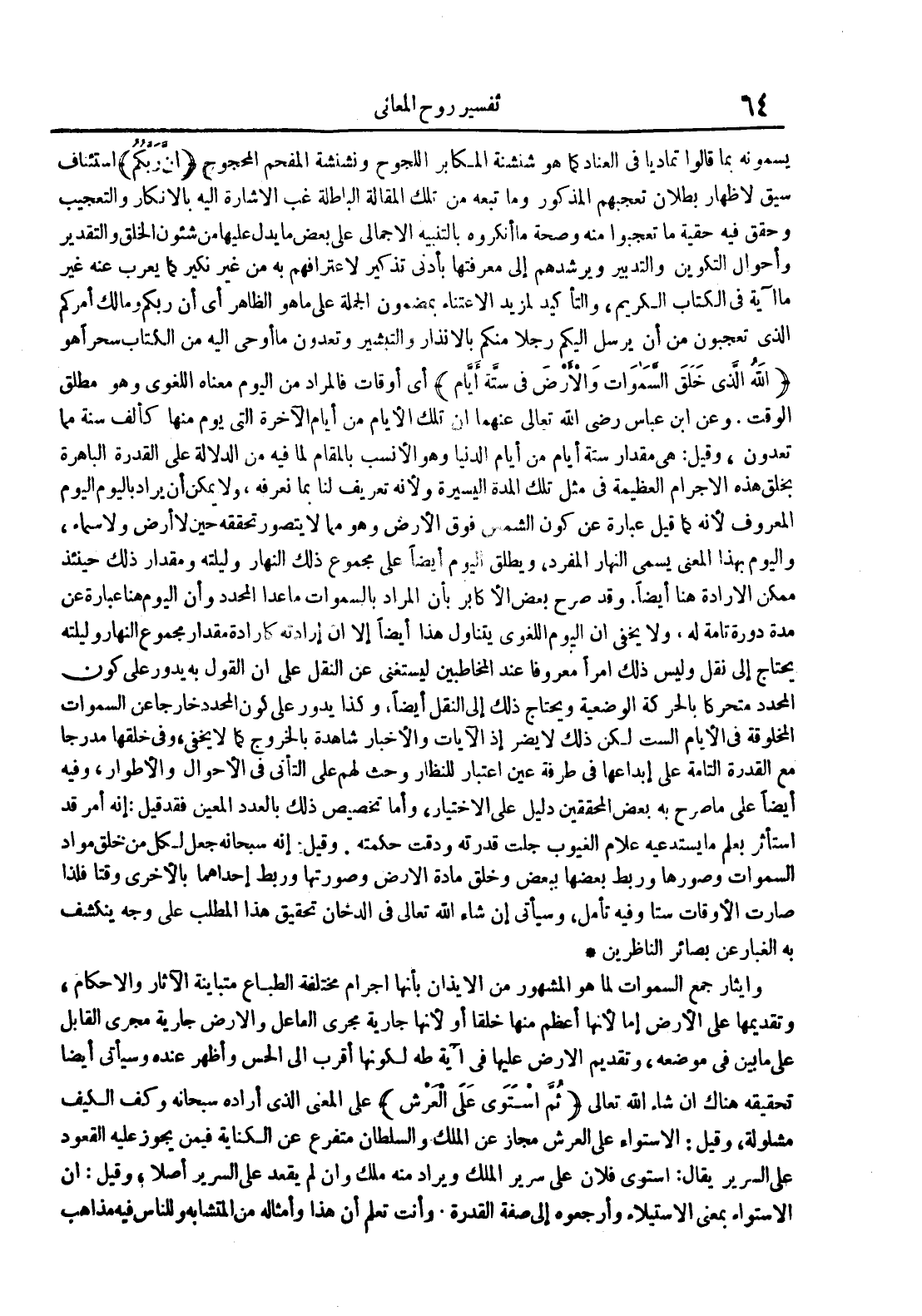 وإيثار جمع السموات لما هو المشهور من الإيذان بأنها أجرام مختلفةالطباع متباينة الآثار والأحكام وتقديمها على الأرض إما لأنها أعظممنها خلقا أو لأنها جارية مجرى الفاعل والأرض جارية مجرى القابل علىما بين في موضعه وتقديم الأرض عليها في آية طه لكونها أقرب إلى الحس وأظهر عنده وسيأتي أيضا تحقيقه هناك إن شاء الله تعالى ثم استوى على العرش على المعنى الذي أراده سبحانه وكف الكيف مشلولة وقيل : الإستواء على العرش مجاز عن الملك والسلطان متفرع عن الكناية فيمن يجوز عليه القعود على السرير يقال : إستوى فلان على سرسر ويراد منه ملك وإن لم يقعد على السرير أصلا وقيل : إن الإستواء بمعنى الإستيلاءوأرجعوه إلى صفة القدرة وأنت تعلم أن هذا وأمثاله من التشابه وللناس فيه مذاهب