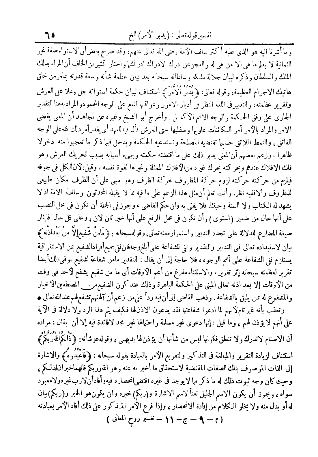 وماأشرنا إليه هو الذي عليه أكثر سلف الأمة رضي الله تعالى عنهم وقد صرح بعض أن الإستواء صفة غير الثمانية لا يعلم ماهي إلا من هي لهوالعجز عن درك الإدراك إدراك وإختار كثير من الخلف أن المراد بذلك الملك والسلطان وذكره لبيان جلالة ملكه وسلطانه سبحانه بعد بيان عظمة شأنه وسعة قدرته بمامر من خلق هاتيك الأجرام العظيمة وقوله تعالى : يدبر الأمر إستئناف لبيان حكمه إستوائه جل وعلا على العرش وتقرير عظمته والتدبير في اللغة النظر في أدبار الإمور وعواقبها لتقع على الوجه المحمود والمراد به هنا التقدير الجاري على وفق الحكمة والوجه الإثم الأكمل وأخرج أبو الشيخ وغيره عن مجاهد أن المعنى يقضي الأمر والمراد بالأمر أمر الكائنات علويها وسفليها حتى العرش فأل فيه للعهد أي يقدر أمر ذلك كله على الوجه الفائق والنمط اللائق حسبما تقتضيه المصلحة وتستدعيه الحكمة ويدخل فيما ذكر ماتعجبوا منه دخولا ظاهرا وزعم بعضهم أن المعنى يدبر ذلك على ماإقتضته حكمته ويهيء أسبابه بسبب تحريك العرش وهو فلك الأفلاك عندهم وبحركته يحرك غيره من الأفلاك الممثلة وغيرها لقوة نفسه وقيل : لأن الكل في جوفه فيلزم من حركته حركته لزوم حركة المظروف لحركة الظرف وهو مبنى على أن الظرف مكان طبيعي للمظروف والأفقيه نظر وأنت تعلم أن مثل هذا الزعم على مافيه مما لا يقبله المحدثون وسلف الأمة إذ لا يشهد له الكتاب ولا السنة وحينئذ فلا يفتى به وإن حكم القاضي وجوز في الجملة أن تكون في محل النصب على أنها حال من ضمير استوى وأن تكون في محل الرفع على أنها خبر ثان لأن وعلى كل حال فإيثار صيغة المضارع للدلالة على تجدد التدبير وإستمراره منه تعالى وقوله سبحانه : مامن شفيع إلا من بعد اذنه بيان لإستبداده تعالى في التدبير والتقدير ونفي للشفاعة على أبلغ وجه فإن نفي جميع أفراد الشفيع بمن الإستغراقية يستلزم نفي الشفاعة على أتم الوجوه فلا حاجة إلى أن يقال : التقدير مامن شفاعة لشفيع وفي ذلك أيضا تقرير لعظمته سبحانه إثر تقرير والإستثناء مفرغ من أعم الأوقات أي مامن شفيع يشفع لأحد في وقت من الأوقات إلا بعد إذنه تعالى المبنى على الحكمة الباهرة وذلك عند كون الشفيع من المصطفين الأخيار والمشفوع له ممن يليق بالشفاعة وذهب القاضي إلى أن فيه ردا على من زعم أن آلهتهم تشفع لهم عند الله تعالى