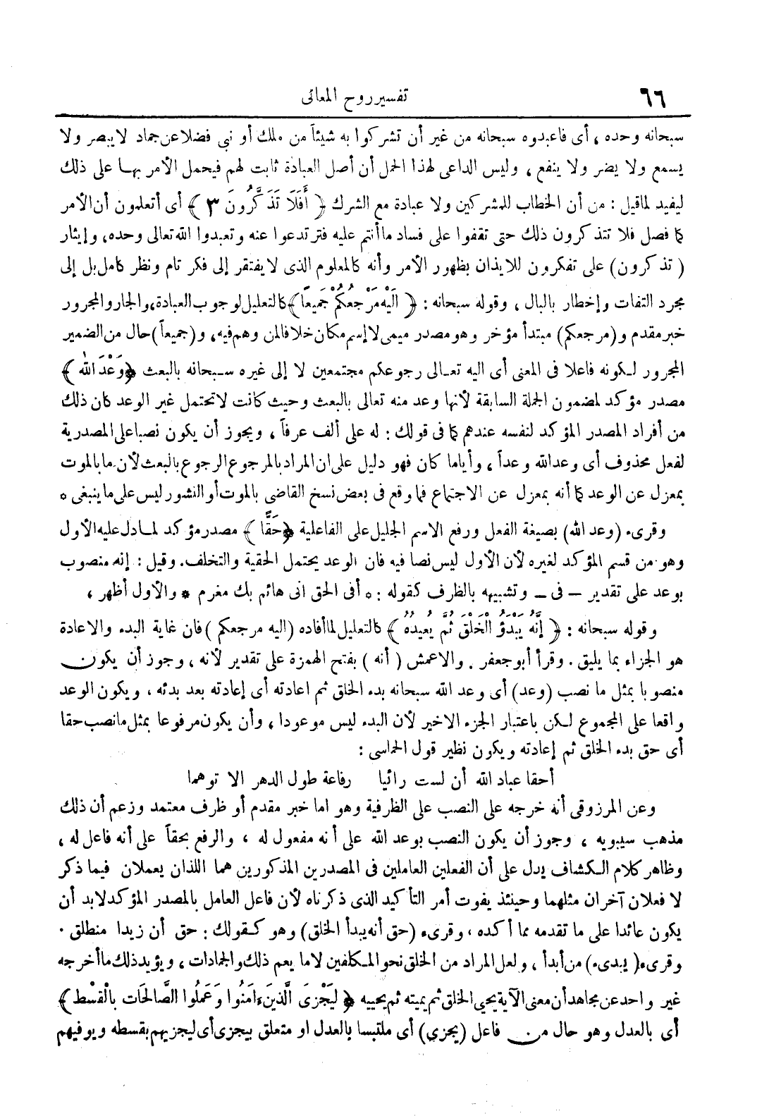 سبحانه وحده أي فإعبدوه سبحانه من غير أن يشركوا به شيئا من ملك أو نبي فضلا عن يبصر ولا يسمع ولا يضر ولا ينفع وليس الداعي لهذا الحمل أن أصل العبادة ثابت لهم فيحمل الأمر بها على ذلك ليفيد لما قيل : من أن الخطاب للمشركين ولا عبادة مع الشرك أفلا يتذكرون 3 أي أتعلمون أن الأمر كما فصل فلا تتذكرون ذلك حتى تقفوا على فساد ماأنتم عليه فترتدعوا عنه وتعبدوا الله تعالى وحده وإيثار تذكرون على تفكرون للإيذان بظهور الأمر وأنه كالمعلوم الذي لا يفتقر إلى فكر تام ونظر كامل بل إلى مجرد إلتفات وإخطار بالبال وقوله سبحانه : اليه مرجعكم جميعا كالتعليل لوجوب العبادة والجار والمجرور خبر متقدم و مرجعكم مبتدأ مؤخر وهو مصدر ميمي لاإسم مكان خلافا لمن وهم فيه و جميعا حال من الضمير المجرور لكونه فاعلا في المعنى أي إليه تعالى رجوعكم مجتمعين لا إلى غيره سبحانه بالبعث وعد الله مصدر مؤكد لمضمون الجملة السابقة لأنها وعد منه تعالى بالبعث وحيث كانت لاتحتمل غير الوعد كان ذلك من أفراد المصدر المؤكد لنفسه عندهم كما في قولك : له على ألف عرفا ويجوز أن يكون نصبا على المصدرية لفعل محذوف أي وعدالله وعدا وأياما كان فهو دليل على ان المراد بالمرجوع الرجوع بالبعث لأن ما بالموت بمعزل عن الوعد كما أنه بمعزل عن الإجتماع فما وقع في بعض نسخ القاضي بالموت أو النشور ليس على ماينبغي