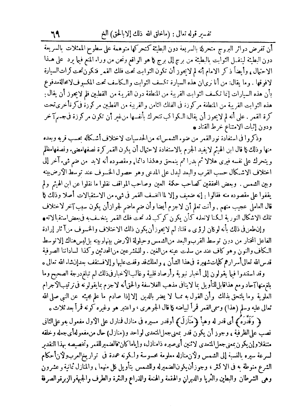 قلنا : لم لا يجوز أن يكون ذلك ألإختلاف والخسوف من آثار إرادة الفاعل المختار من دون توسط القرب والبعد من الشمس وحيلوية الأرض بينها وبينه بل ليس هناك إلا توسط الكاف والنون وهو كاف عند من سلمت عينه من الغين وللمتشرعين من المحدثين وكذا لساداتنا الصوفية قدس الله تعالى أسرارهم كلمات شهيرة في هذا الشأن ولعلك قد وقفت عليها وإلا فستقف بعد إن شاء الله تعالى