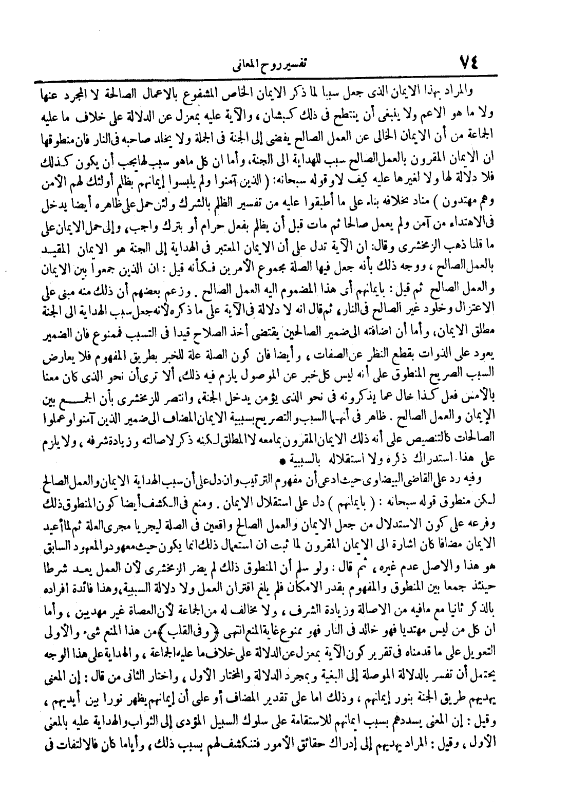 والمراد بهذا الإيمان الذي جعل سببا لما ذكر الإيمان الخاص المشفوع بالأعمال الصالحة لا المجرد عنها ولا ما هو الأعم ولا ينبغي أن ينتطح فيذلك كبشان والآية عليه بمعزل عن الدلالة على خلاف ما عليه الجماعة من أن الإيمان الخالي عن العمل الصالح يفضي إلى الجنة في الجملة ولا يخلد صاحبه في النار فإن منطوقها أن الإيمان المقرون بالعمل الصالح سبب للهداية إلى الجنة وأما أن كل ما هو سبب لها يجب أن يكون كذلك فلا دلالة لها ولا لغيرها عليه كيف لا وقوله سبحانه : الذين آمنوا ولم يلبسوا إيمانهم بظلم أولئك لهم الأمن وهم مهتدون مناد بخلافه بناءعلى ما أطبقوا عليه من تفسير الظلم بالشرك ولئن حمل على ظاهره أيضايدخل في الإهتداء من آمن ولم يعمل صالحا ثم مات قبل أن يظلم بفعل حرام أو بترك واجب وإلى حمل الإيمان على ما قلنا ذهب الزمخشري وقال : إن الآية تدل على أن الإيمان المعتبر في الهداية إلى الجنة هوالإيمان المقيد بالعمل الصالح ووجه ذلك بأنه جعل فيها الصلة مجموع الأمرين فكأنه قيل : إن الذين جمعوا بين الإيمان والعمل الصالح ثم قيل : بإيمانهم أي هذا المضموم إليه العمل الصالح وزعم بعضهم أن ذلكمنه مبني على الإعتزال وخلود غير الصالح في النار ثم قال إنه لادلالة في الآية على ما ذكره لأنه جعل سبب الهداية إلى الجنة مطلق الإيمان وأما أن اضافته الى ضمير الصالحين يقتضي أخذ الصلاح قيدا في التسبب فممنوع فإن الضمير يعود على الذوات بقطع النظر عن الصفات وأيضا فإن كون الصلة علة للخبر بطريق المفهوم فلا يعارض السبب الصريح المنطوق على أنه ليس كل خبر عن الموصول يلزم فيه ذلك ألا ترى أننحوه الذي كان معنا بالأمس فعل كذا خال عما يذكرونه في نحو الذي يؤمنيدخل الجنة وإنتصر للزمخشري بأن الجمع بين الإيمان والعمل الصالح ظاهر في أنهما السبب والتصريح بسببية الإيمان المضاف إلى ضمير الذين آمنوا وعملوا الصالحات كالتنصيص على أنه ذلك الإيمان المقرون بما معه لا المطلق لكنه ذكر لأصالته وزيادة شرفه ولا يلزم على هذا إستدراكذكره ولا إستقلاله بالسببية