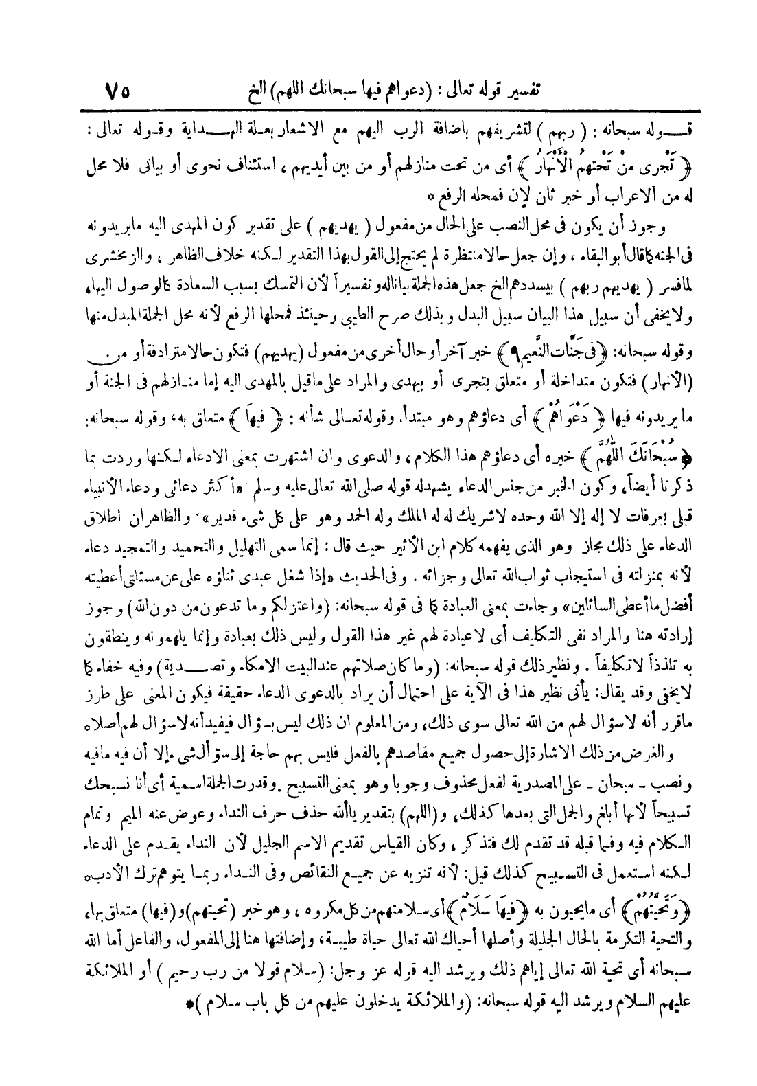 وجوز أن يكون في محل النصب على الحال من مفعول يهديهم على تقديركون المهدي إليه ما يردونه في الجنه كما قال أبو البقاء وإن جعلحالا منتظرة لم يحتج إلى القول بهذا التقدير لكنه خلاف الظاهر والزمخشري لما فسر يهديهم ربهم بيسددهم إلخ جعل هذه الجملة بيانا له وتفسيرا لأن التمسك بسبب السعادة كالوصول إليها ولا يخفى أن سبيلهذا البيان سبيل البدل وبذلك صرح الطيبي وحينئذ فمحلها الرفع لأنه محل الجملة المبدل منها وقوله سبحانه : في جنات النعيم 9 خبر آخرأو حال أخرى من مفعول يهديهم فتكون حالا مترادفة أو من الأنهار فتكون متداخلة أو متعلق بتجري أو بيهدي والمراد على ما قيل بالمهدي إليه إما منازلهم في الجنة أو ما يريدونه فيها دعواهم أي دعاؤهم وهو مبتدأ وقوله تعالى شأنه : فيها متعلق به وقوله سبحانه : سبحانك اللهم خبره أي دعاؤهم هذا الكلام والدعوى وإن إشتهرت بمعنى الإدعاء لكنها وردت بما ذكرنا أيضا وكون الخبر من جنس الدعاء يشهد له قوله صلى الله تعالى عليه وسلم أكثر دعائي ودعاء الأنبياء قبلي بعرفات لا إله إلاالله وحده لا شريك له له الملك وله الحمد وهو على كل شيء قدير والظاهر أن إطلاق الدعاء على ذلك مجاز وهو الذي يفهمه كلام ابن الأثيرحيث قال : إنما سمي التهليل والتحميد والتمجيد دعاء لأنه بمنزلته في إستيجاب ثواب الله تعالى وجزائه وفي الحديث إذا شغل عبدي ثناؤه علي عن مسئلتي أعطيته أفضل ما أعطي السائلين وجاءت بمعنى العبادة كما في قوله سبحانه : وأعتزلكم وما تدعون من دون الله وجوز إرادته هنا والمراد نفي التكليف أي لا عبادة لهم غير هذا القول وليس ذلك بعبادة وإنما يلهمونه وينطقون به تلذذا لا تكليفا ونظير ذلك قوله سبحانه : وما كان صلاتهم عند البيت إلا مكاء وتصدية وفيه خفاء كما لا يخفى وقد يقال : يأتي نظير هذا في الآية على إحتمال أن يراد بالدعوىالدعاء حقيقة فيكون المعنى على طرز ما قرر أنه لا سؤال لهم من اللهتعالى سوى ذلك ومن المعلوم أن ذلك ليس بسؤال فيفيد أنه لاسؤال لهم أصلا