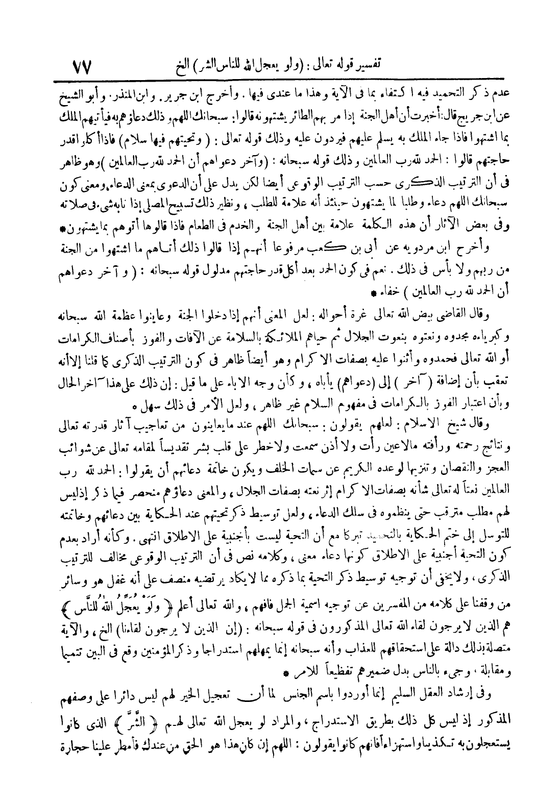 وقال شيخ الإسلام : لعلهم يقولون : سبحانك اللهم عندما يعاينون من تعآجيب آثار قدرته تعالى ونتائج رحمته ورأفته ما لا عين رأت ولا أذن سمعت ولا خطر على قلب بشر تقديسا لمقامه تعالى عن شوائب العجزوالنقصان وتنزيها لوعده الكريم عن سمات الخلف ويكون خاتمة دعائهم أن يقولوا : الحمد لله رب العالمين نعتا له تعالى شأنه بصفات الإكرام إثر نعته بصفات الجلال والمعنى دعاؤهم منحصر فيما ذكر إذ ليس لهم مطلب مترقب حتى ينظموه في سلك الدعاء ولعل توسيط ذكر تحيتهم عند الحكاية بين دعائهم وخاتمته للتوسل إلى ختم الحكاية بالتحميد تبركا مع أن التحية ليست بأجنبية على الإطلاق إنتهى وكأنه أراد بعدم كون التحية أجنبية على الإطلاق كونها دعاء معنى وكلامه نص في أن الترتيب الوقوعي مخالف للترتيب الذكري ولا يخفى أن توجيه توسيط ذكر التحية بما ذكره مما لا يكاد يرتضيه منصف على أنه غفل هو وسائر من وقفنا على كلامه من المفسرين عن توجيه إسمية الجمل فإفهم والله تعالى أعلم ولو يعجل الله للناس هم الذين لا يرجون لقاء الله تعالى المذكورون في قوله سبحانه : إن الذين لا يرجون لقاءنا إلخ والآيةمتصلة بذلك دالة على إستحقاقهم للعذاب وأنه سبحانه إنما يمهلهم إستدراجا وذكر المؤمنين وقع في البين تتميما ومقابلة وجيء بالناس بدل ضميرهم تفظيعا للأمر