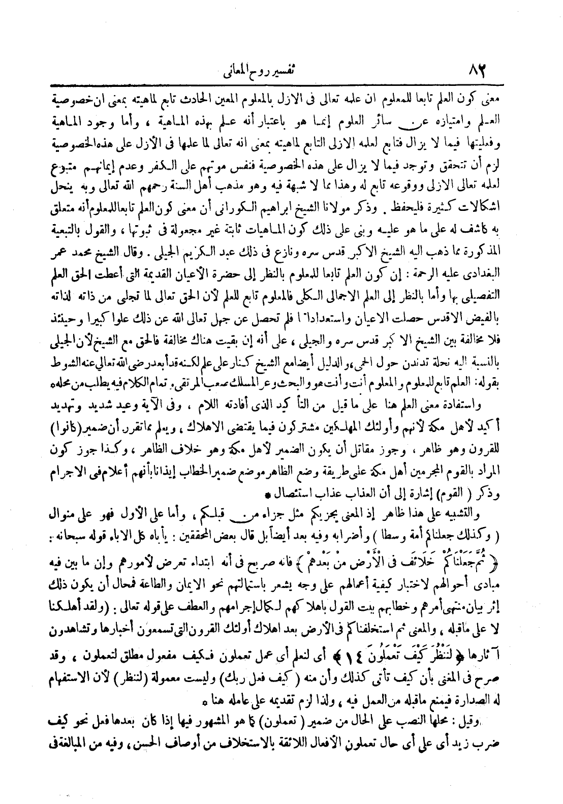 والتشبيه على هذا ظاهر إذ المعنى يجزيكم مثل جزاء من قبلكم وأما على الأول فهو على منوال وكذلك جعلناكم أمة وسطا وأضرابه وفيه بعد أيضا بل قال المحققين : يأباه كل الإباء قوله سبحانه : ثم جعلناكم خلائف في الأرض من بعدهم فإنه صريح في أنه إبتداء تعرض لأمورهم وإن ما بين فيه ميادىء أحوالهم لأختبار كيفية أعمالهم على وجه يشعر بإستمالتهم نحو الإيمان والطاعة فمحال أن يكون ذلك إثر بيان منتهى أمرهم وخطابهم ببت القول بإهلاكهم لكمال إجرامهم والعطف على قوله تعالى : ولقد أهلكنا لا على ما قبله والمعنى ثم إستخلفناكم في الأرض بعد اهلاك أولئك القرون التي تسمعون أخبارها وتشاهدون آثارها لننظر كيف تعلمون 14 أي لنعلم أي عمل تعملون فكيف مفعول مطلق لتعلمون وقد صرح في المغنى بأن كيف تأتي كذلك وأن منه كيف فعل ربك وليست معمولة لننظر لأن الإستفهام له الصدارة فيمنع ما قبله من العمل فيه ولذا لزم تقديمه على عامله هنا