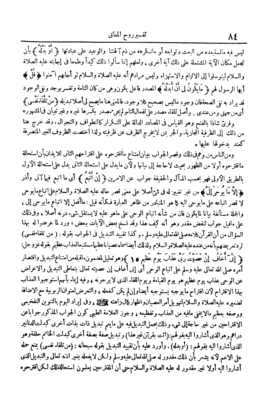 ومن الناس من وهم في ذلك وقصر الجواب ببيان إمتناع ماإقترحوه على إقتراحهم الثاني للإيذان بأن إستحالة ماإقترحوه أولا من الظهور بحيث لا حاجة إلى بيانها ولأن ما يدل على إستحالة الثاني يدل على إستحالة الأول بالطريق الأولى فهو بحسب المآل والحقيقة جواب عن الأمرين إن اتبع أي ما أتبع فيما آتى وأذر لا مايوحى إلى من غير تغيير له في شيء أصلا على معنى قصر حاله عليه الصلاة و السلام على إتباع ما يوحى لا قصر إتباعه على ما يوحى إليه كما هو المتبادر من ظاهر العبارة فكأنه قيل : ماأفعل إلا إتباع ما يوحى إلى والجملة مستأنفة بيانا لما يكون فإن من شأنه إتباع الوحي على ما هو عليه لا يستقل بشيء دونه أصلا وفي ذلك على ما قيل جواب لنقص مقدر وهو أنه كيف هذا وقد نسخ بعض الآيات ببعض ورد لما عرضوا له بهذا السؤال من أن القرآن كلامه صلى الله تعالى عليه وسلم وكذا تقييد التبديل في الجواب بقوله : من تلقاء نفسي لرد تعريضهم بأنه من عنده عليه الصلاة و السلام ولذلك أيضا سماه عصيانا عظيما مستتبعا العذاب عظيم بقوله عز و جل : إني أخاف إن عصيت ربي عذاب يوم عظيم 15 وهو تعليل لمضمون ما قبله من إمتناع التبديل وإقتصار أمره صلى الله تعالى عليه وسلم على إتباع الوحي أي إني أخاف إن عصيته تعالى بتعاطي التبديل والإعراض عن الوحي عذاب يوم عظيم هو يوم القيامة ويوم اللقاء الذي لا يرجونه وفيه إيماء بأنهم إستوجبوا العذاب بهذا الإقتراح لأن إقتراح ما يوجبه يستوجبه أيضا وإن لم يكن كفعله والتعرض لعنون الربوبية مع الإضافة لضميرهعليه الصلاة و السلام لتهويل أمر العصيان وإظهار كمال نزاهته صلى الله عليه و سلم وفي إيراد اليوم بالتنوين التفخيمي ووصفه بعظيم ما لا يخفى ما فيه من العذاب و تفظيعه وجوز العلامة الطيبي كون الجواب المذكور جوابا عن الإقتراحين من غير حاجة إلى شيء وذلك بحمل التبديل فيه على ما يعم تبديل ذات بذات أخرى كبدلت الدنانير دراهم وهو الذي أشاروا إليه بقولهم : ائت بقرآن غير هذا وتبديل صفة بصفة أخرى كبدلت الخاتم حلقة وهو الذي أشاروا إليه بقولهم : أوبدله وأورد عليه بأن تقييد التبديل بقوله سبحانه : من تلقاء نفسي يمنع حمله على الأعم لأنه يشعر بأن ذلك مقدور له صلى الله تعالى عليه وسلم ولكن لا يفعله بغير إذنه تعالى والتبديل الذي على الأعم لأنه يشعر بأن ذلك مقدور له صلى الله تعالىعليه وسلم ولكن لا يفعله بغير إذنه تعالى والتبديل الذي أشاروا إليه أولا غير مقدور له عليه الصلاة و السلام حتى أن المقترحين يعملون إستحالة ذلك لكن إقترحوه