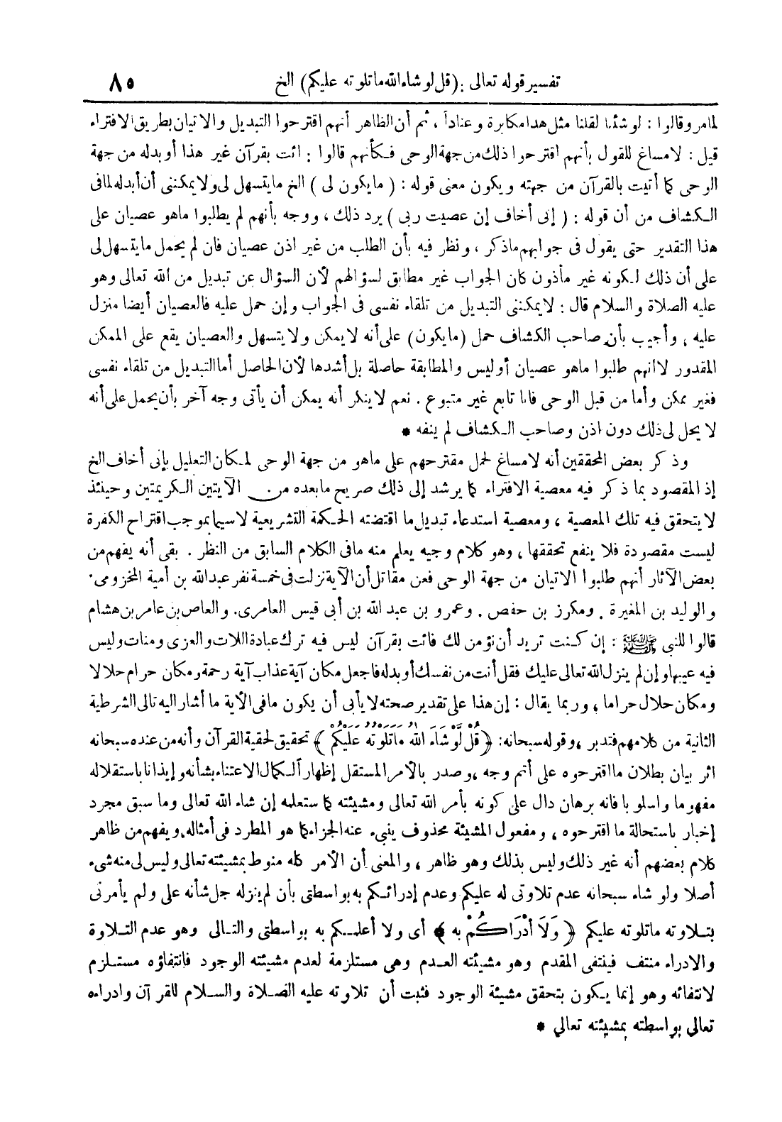 وذكر بعض المحققين أنه لامساغ لحمل مقترحهم على ماهو من جهة الوحي لمكان التعليل بإني أخاف إلخ إذ المقصود بما ذكر فيه معصية الإفتراء كما يرشد إلى ذلك صريح مابعده من الآيتين الكريمتين وحينئذ لايتحقق فيه تلك المعصية ومعصية إستدعاء تبديل مااقتضته الحكمة التشريعية لا سيما بموجب لقتراح الكفرة ليست مقصودة فلا ينفع تحققها وهو كلام وجيه يعلم منه مافي الكلام السابق من النظر بقي أنه يفهم من بعض الآثار أنهم طلبوا الإتيان من جهة الوحي فعن مقاتل أن الآية نزلت في خمسة نفر عبدالله بن أمية المخزومي والوليد بن المغيرة ومكرز بن حفص وعمرو بن عبدالله بن أبي قيس العامري والعاص بن عامر بن هشام قالوا للنبي صلى الله عليه و سلم : إن كنت تريد أن نؤمن لك فائت بقرآن ليس فيه ترك عبادة اللات والعزى ومنات وليس فيه عيبها وإن لم ينزل اله تعالى عليكفقل أنت من نفسك أو بدله فإجعل مكان آية عذاب آية رحمة ومكان حرام حلالا ومكان حلال حراما وربما يقال : إن هذا على تقدير صحته لا يأبى أن يكون مافي الآية ماأشار اليه تالى الشرطية الثانية من كلامهم فتدبر وقوله سبحانه : قل لوشاء الله ماتلوته عليكم تحقيق لحقية القرآن وأنه من عنده سبحانه إثر بيان بطلان ماإقترحوه على أتم وجه وصدر بالأمر المستقل إظهارالكمال الإعتناءبشأنه وإيذانا بإستقلاله مفهوما وأسلوبا فإنه برهان دال على كونه بأمر الله تعالى ومشيئته كما ستعلمه إن شاء الله تعالى وماسبق مجرد إخبار بإستحالة ماإقترحوه ومفعول المشيئة محذوف ينبيء عنه الجزاء كما هو المطرد في أمثاله ويفهم من ظاهر كلام بعضهم أنه غير ذلك وليس بذلك وهو ظاهر والمعنى أن الأمر كله منوط بمشيئته تعالى وليس لي منه شيء أصلا ولو شاء سبحانه عدم تلاوتي له عليكم وعدم إدرائكم به بواسطتي بأن لم ينزله جل شأنه علي ولم يأمرني بتلاوته ماتلوته عليكم ولا أدراكم به أي ولا أعلمكم به بواسطتي والتالي وهو عدم التلاوة والإدراء منتف فينتفي المقدم وهو مشيئته العدم وهي مستلزمة لعدم مشيئته الوجود فانتفاؤه مستلزم لإنتفائه وهو إنما يكون بتحقق مشيئة الوجود فثبت أن تلاوته عليه الصلاة و السلام للقرآن وادراءه تعالى بواسطته بمشيئته تعالى