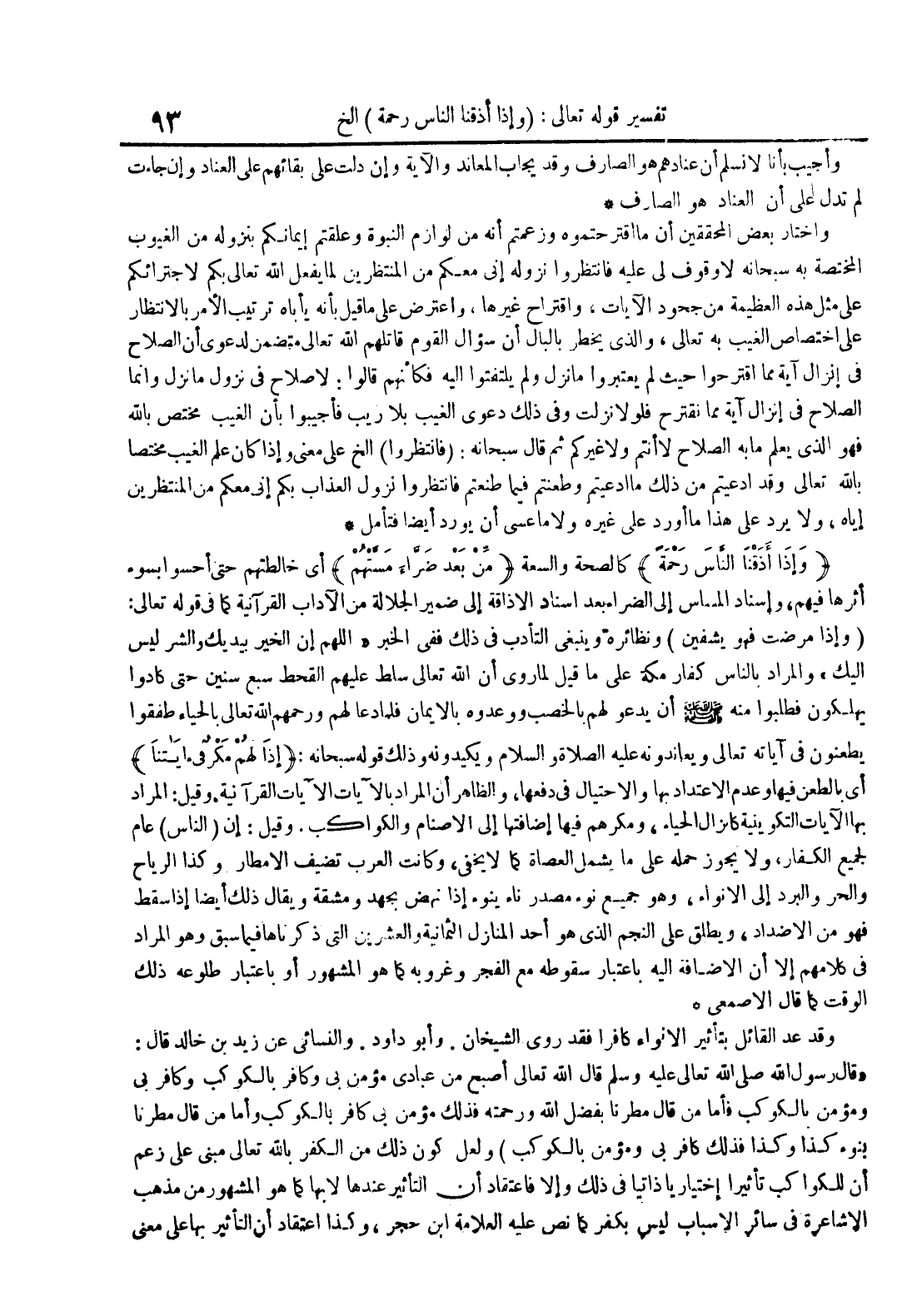وقد عد القائل بتأثير الأنواء كافرا فقد روى الشيخان وأبو داود والنسائي عن زيد بن خالد قال : قال رسول الله صلى الله تعالى عليه وسلم قال الله تعالى أصبح من عبادي مؤمن بي وكافربالكوكب وكافر بي ومؤمن بالكوكب فأما من قال مطرنا بفضل الله ورحمته فذلك مؤمن بي وكافر بالكوكب وأما من قال مطرنا بنوء كذا وكذا فذلك كافر بي ومؤمن بالكوكب ولعل كون ذلك من الكفر بالله تعالى مبني علىزعم أن للكواكب تأثيرا إختياريا ذاتيا في ذلك وإلا فإعتقاد أن التأثيرعندها لا بها كما هو المشهور من مذهب الأشاعرة في سائر الأسباب ليس بكفر كما نص عليه العلامة ابن حجر وكذا إعتقاد أن التأثير بها على معنى