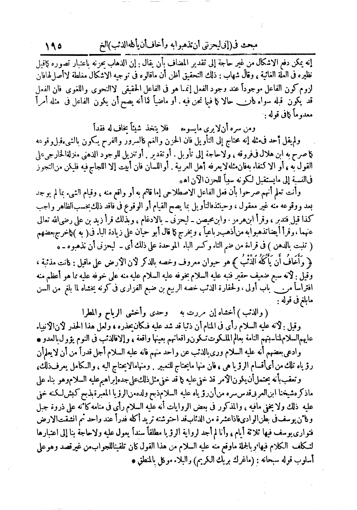 إنه يمكن دفع الإشكال من غير حاجة إلى تقدير المضاف بأن يقال : إن الذهاب يحزنه باعتبار تصوره كما قيل نظيره في العلة الغائية وقال شهاب : ذلك التحقيق أظن ما قالوه في توجيه الإشكال مغلطة لا أصل لها فإن لزوم كون الفاعل موجودا عند وجود الفعل إنما هو الفاعل الحقيقي لا النحوي واللغوي فإن الفعل قد يكون قبله سواء كان حالا كما فيما نحن فيه أو ماضيا كما أنه يصح أن يكون الفاعل في مثله أمرا معدوما كما في قوله : ومن سره أن لا يرى ما يسوءه فلا يتخذ شيئا يخاف له فقدا ولم يقل أحد في مثله إنه محتاج إلى التأويل فإن الحزن والغم كالسرور والفرح يكون بالشيء قبل وقوعه كما صرح به ابن هلال في فروقه ولا حاجة إلى تأويل أو تقدير أو تنزيل للوجود الذهني منزلة الخارجي على القول به أو الإكتفاء به فإنه مثله لا يعرفه أهل العربية أو اللسان فإن أبيت إلا اللجاج فيه فليكن من التجوز في النسبة إلى ما يستقبل لكونه سببا للحزن الآن أه